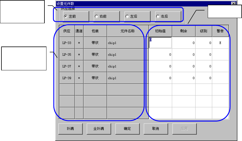 操作手册Ⅱ 2-9-1 - 1 设置项目 调出设置元件数画面时,显示下列项目: NO. 项目 内容 1 供应 显示元件的供应位置(台架) 。 (LF :左前方, LR :左后方, RF :右前方, RR :右后方 ) 2 通道 当使用管状送料器时显示通道。 3 包装 显示元件的包装形态。 ( 带状、管状 、散装等 ) 4 元件名称 显示元件名称。 请设置下列项目: NO. 项目 内容 1 初始值 - 设置按包装方式供给的、使用前的 元件…