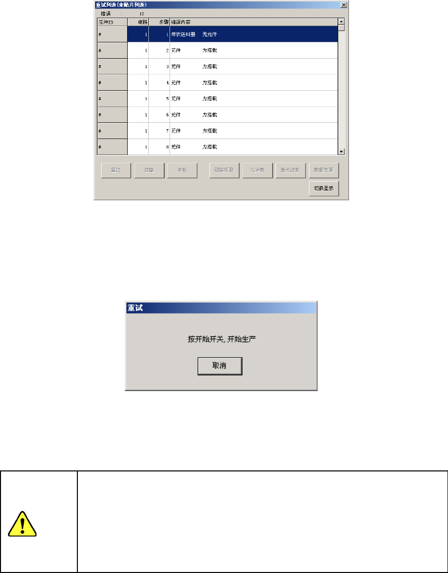 重试列表 (未贴片列表)的功能:提供生产中发生的错误情况,用以判断是否继续生产。