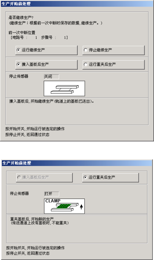 [生产开始前处理]对话框中,不论是否有继续生产文件,都会显示搬入基板后生产、或
