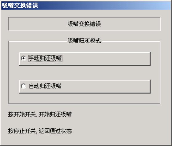 之后,显示下列对话框,要求手动归还吸嘴、或自动归还吸嘴。