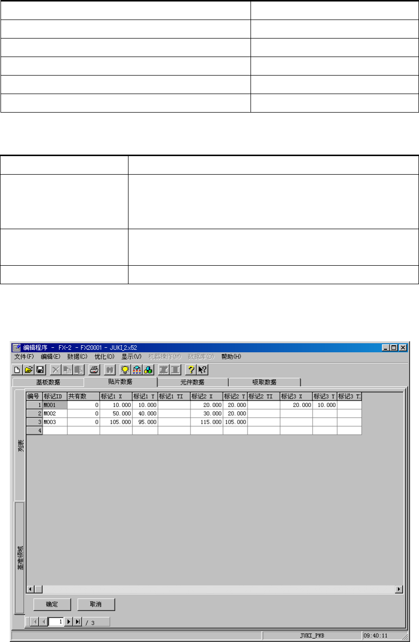 操作手册Ⅱ 表 3-5-1 打开 基准 领 域画面的方法 动作 画面显示模式 选择标记弹出菜单上的 [ 编辑 ] 时 编辑、选择模式 选择标记弹出菜单上的 [ 浏览 ] 时 选择模式 单击基准领域标签时 编辑模式 按 F9 键时 编辑模式 双击有标记的单元格时 选择模式 表 3-5-2 基准领 域画面的 显 示模式 画面显示模式 处理内容 选择模式 注册贴片数据使用的标记数据 在列表上光标选择时显示全行状态。 [ 确认 ] 按钮浅色显示…