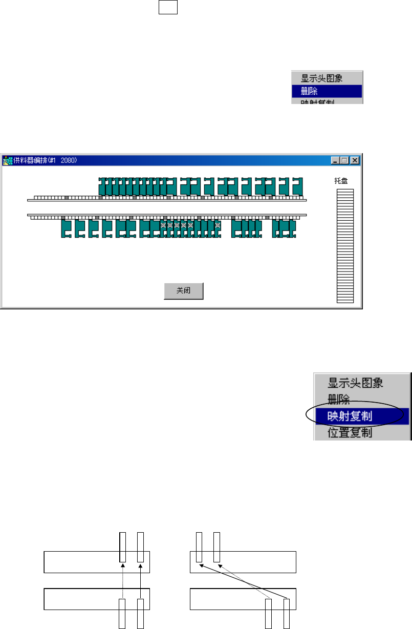 操作手册Ⅱ ④ 删除供料器 选择供料器,在反色显示状态下, 按 DEL 键可删除供料器。或选中供料器,在反色显示状态 下, 按鼠标的右,从显示的菜单中选择删 除。 ⑤ 显示贴片头图像 将供料器配置窗口的显示模式变更为 贴片头 图像显示模式。 点击鼠标的右按钮, 选中贴片头图像 显示。 贴片头图像显示模式中,以图像形式显示贴片头的间隔。把供料器对准贴片头间隔进行编排,即可 按指定同时吸取。 贴片头图像显示模式可通过点击鼠标 的左键来解除。…