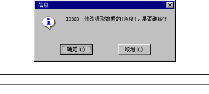 操作手册Ⅱ 但若已有吸取数据时,会出现以下提示。 图 4-1- 6 确认变更角 度的信息 确定 修改吸取数据的角度。 取消 不修改吸取数据设定的角度。 已有同一元件名称时,不能进行复制。 贴片数据中已输入有元件名时,请从 [ 命令列表 ] 调出元件数据。 从元件数据执行时,所选择的元件数据内容将被复制,元件名称不变。 ② [ 取消 ] 按钮 返回到元件数据库 [ 命令列表 ] 画面。 4-4