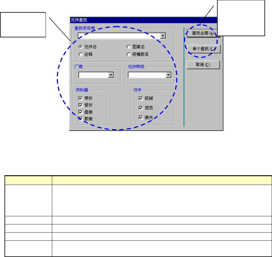 查找字符串 用按钮指定元件名、图案名(涂层图案)、注释、吸嘴数目(吸嘴号码)