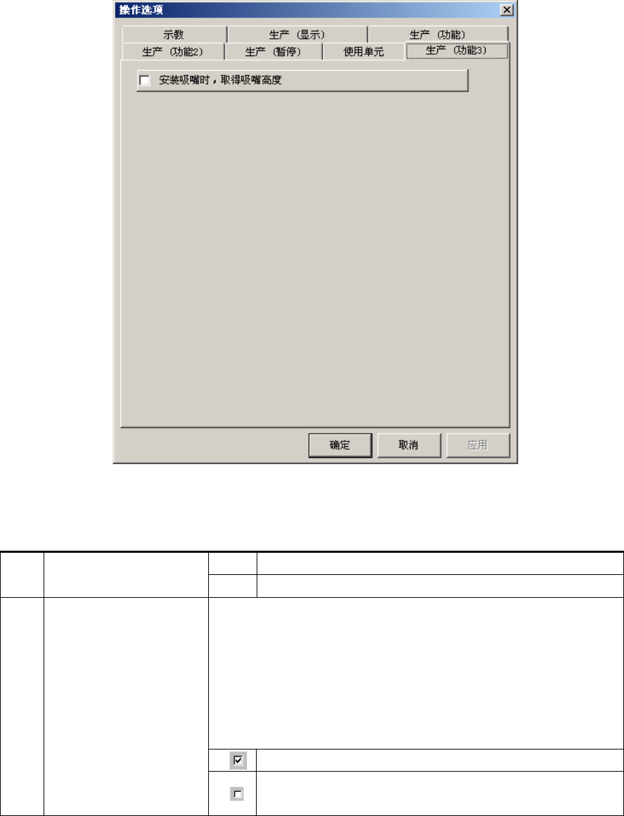 操作手册Ⅱ 4-2-2 - 5 设置生产(功能 3 ) 选项 单击[生产 ( 功能 3) ]标签后,会显示设置[生产 ( 功能 3) ]对话框。 图 4-2- 5 设置生产( 功能 3 )选项 各选项的详细内容如下。 表 4-2- 6 生产(功能 3 )选项设置项目的详细及 内容 No. 项目 内容 状态 动作以及详细内容 1 安装吸嘴时,取得吸嘴 高度 系安装吸嘴时用激光测量吸嘴高度的 功能。 通过掌握实际测量的吸嘴高度,可在识别元件…