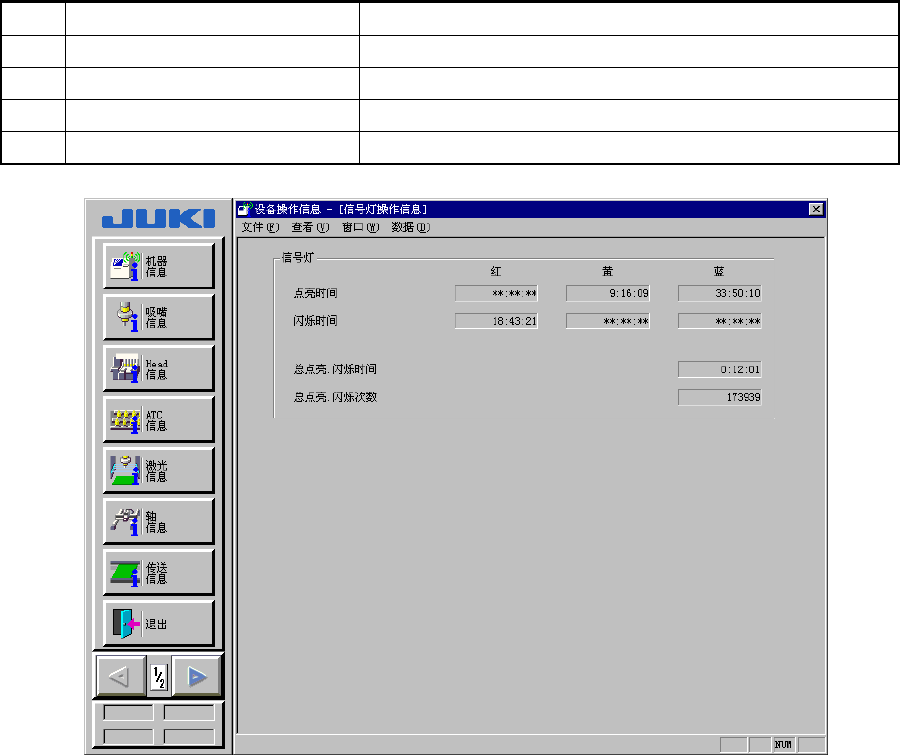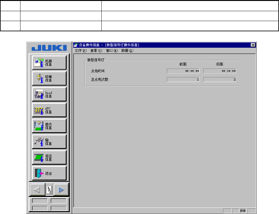 操作手册Ⅱ 4-3-1 - 5 信号灯运行信息 在菜单栏中选择 [ 窗口 ] → [ 灯 ] → [ 信号灯运行信息 ] 后,显示 [ 信号灯运行信息 ] 画面。 表 4-3-5 信号灯运行信 息的显示内容 No 项目 内容 1 点亮时间 各种信号灯(红、黄、蓝)点亮的累计时间。 2 闪烁时间 各种信号灯(红、黄、蓝)闪烁的累计时间。 3 总点亮、闪烁时间 信号灯的点亮、闪烁时间累计时间。 4 总点亮、闪烁次数 信号灯的点亮、闪烁次数累…