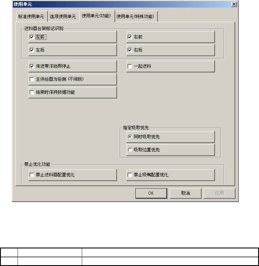 操作手册Ⅱ 使用单元(功能) 选择 [ 使用单元(功能) ] 标签之后,会显示如下的设置 [ 使用单元(功能) ] 对话框。 图 4-4- 27 设置使用单 元(功能)对话框 (1) 设置项目 在 [ 使用单元(功能) ] 对话框中的设置项目如下表。 表 4-4- 18 设置项目 No. 项目 设置的内容 1 使用单元(功能) 使用 / 不使用功能 为完成生产程序的贴片,需要上述指定为“不使用 ”的功能时,有关的贴装状况,请参见 「表 …