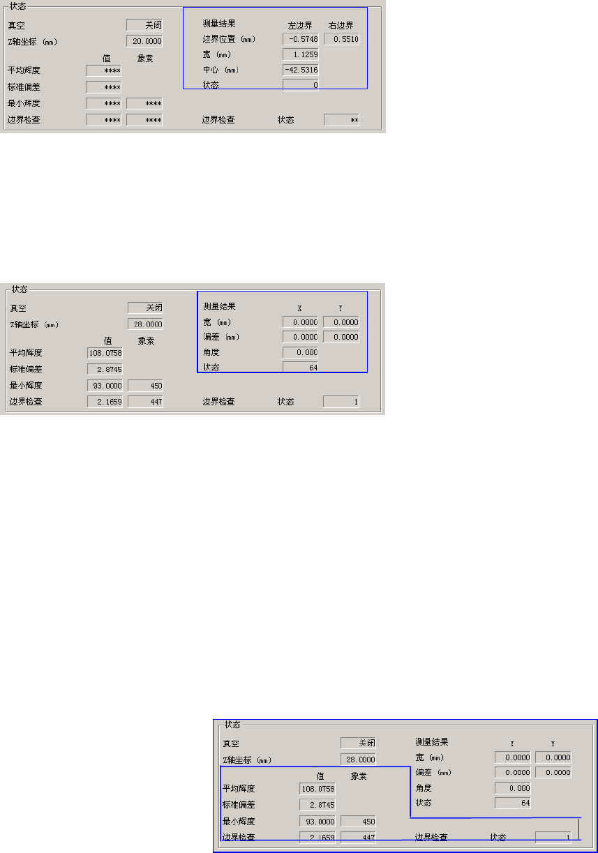操作手册Ⅱ (6) 状态显示 在控制完成时,显示控制单元的真空的打开 / 关闭状态、 Z 轴坐标、激光的测量结果。 显示项目会根据所进行的控制发生变化。 1) 运行测量 (ONCE) 时的结果 边界位置 : 从旋转中心到边界的距离 宽 : 阴影的宽度幅(左边界~右边界的距离) 中心 : 阴影的中心位置 (LNC60 绝对坐标系 ) 状态 : ONCE 运行状态代码 ( 参见 表 4-5-6 激光的状态一览 ) 2) 运行测量 (SWEE…