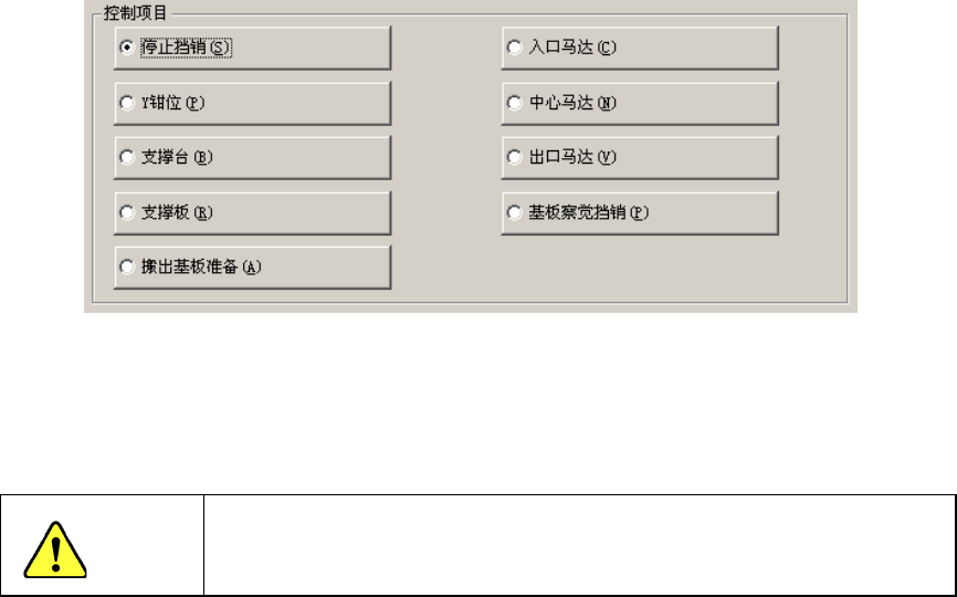 操作手册Ⅱ (1) 控制项目 用单选按钮选择控制项目。 (2) 控制按钮 用控制按钮操作控制项目。 不同的控制项目,显示不同控制按钮。 按下控制按钮后,设备即开始运 行。按下控制按钮前,请 务必确认设备 内部没有正在操作的人。另外, 为防止人身伤害,设备运 行中切勿把手 伸入设备内部,脸和头也不要靠近。 1) 停止挡销 控制停止挡销的打开 / 关闭。 选中控制项目 [ 停止挡销 ] 时 ,选 择 [ 打开 ] 按钮、 [ 关闭 ] 按钮…