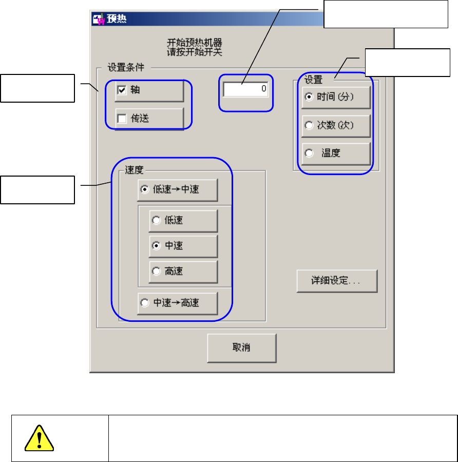在主画面的菜单栏中选择 [维护]→[预热...],或选择[预热]命令按钮后,显示下图的[预