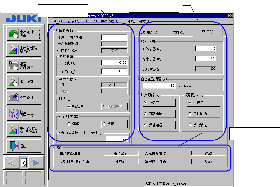 在画面左侧的共同设置项目上,设置计划生产数量、贴片偏差、顺序以及运行模式等项目。