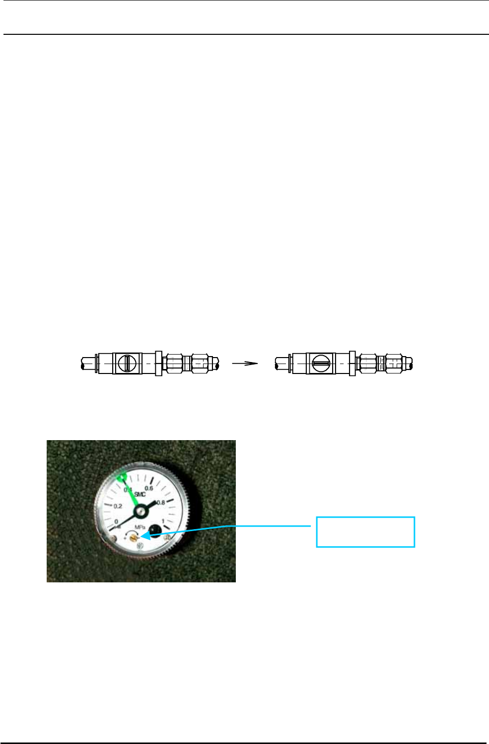 Rev.1.00 安装要领书 10. 空气管道的连接 < 程序 > 1. 把工厂侧配管 (φ 12 ) 安装到机械手阀门。 2. 转动机械手阀门的手柄,向贴片机主机里供给空气。 3. 向下拉真空器的压力调整手柄,然后转动,把使用空气压力调整为 0.49Mpa 。 4. 请确认压力表的绿色箭头, 压力设定应为 0.4Mpa( 4kgf/c㎡ ) 。 另外, 调整时, 请用一字形螺丝刀插到 压力表的一字凹槽里转动调整。 ( 工厂出货时已经进…