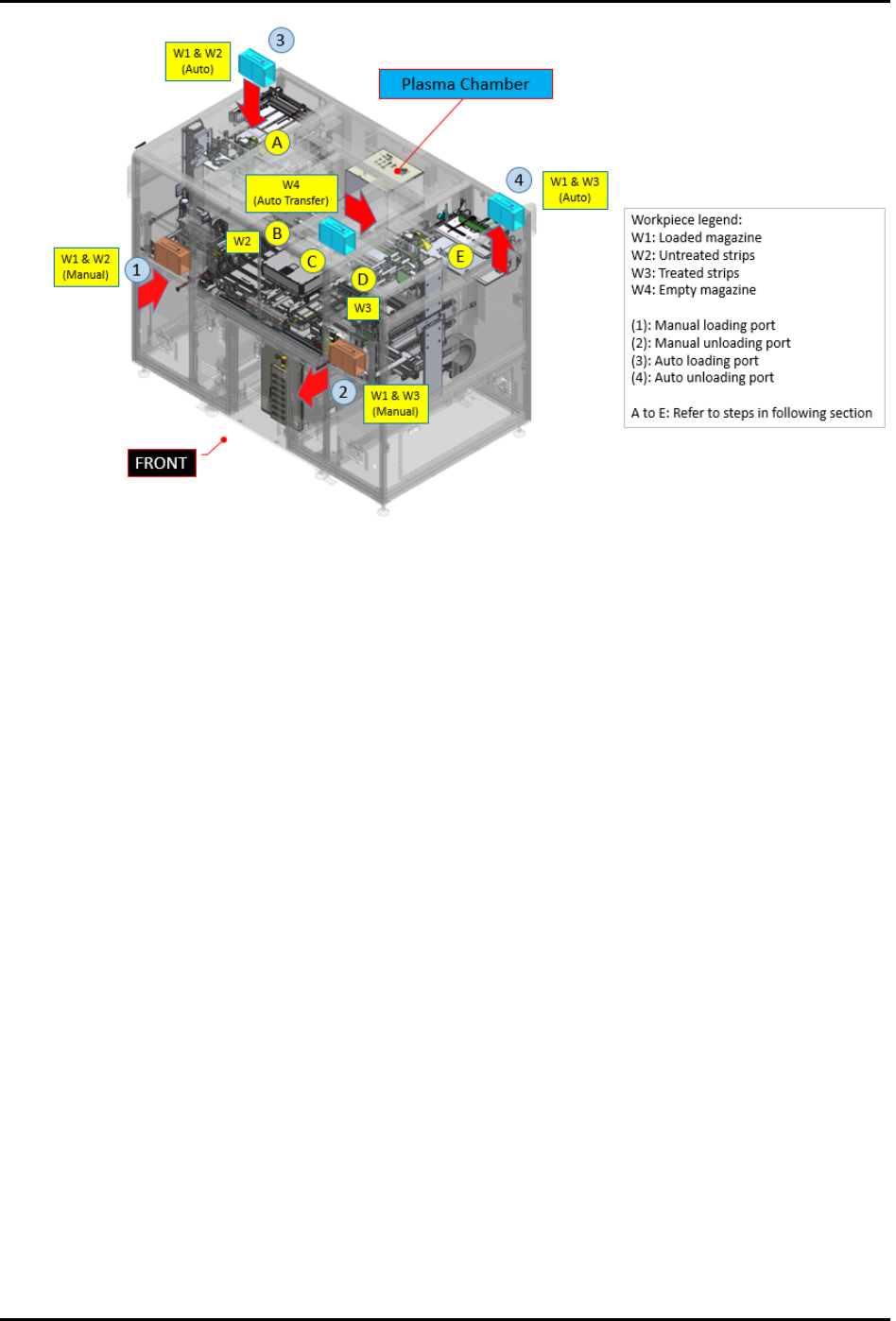 1. Load magazine with untreated strips into overhead magazine auto loading port (3).