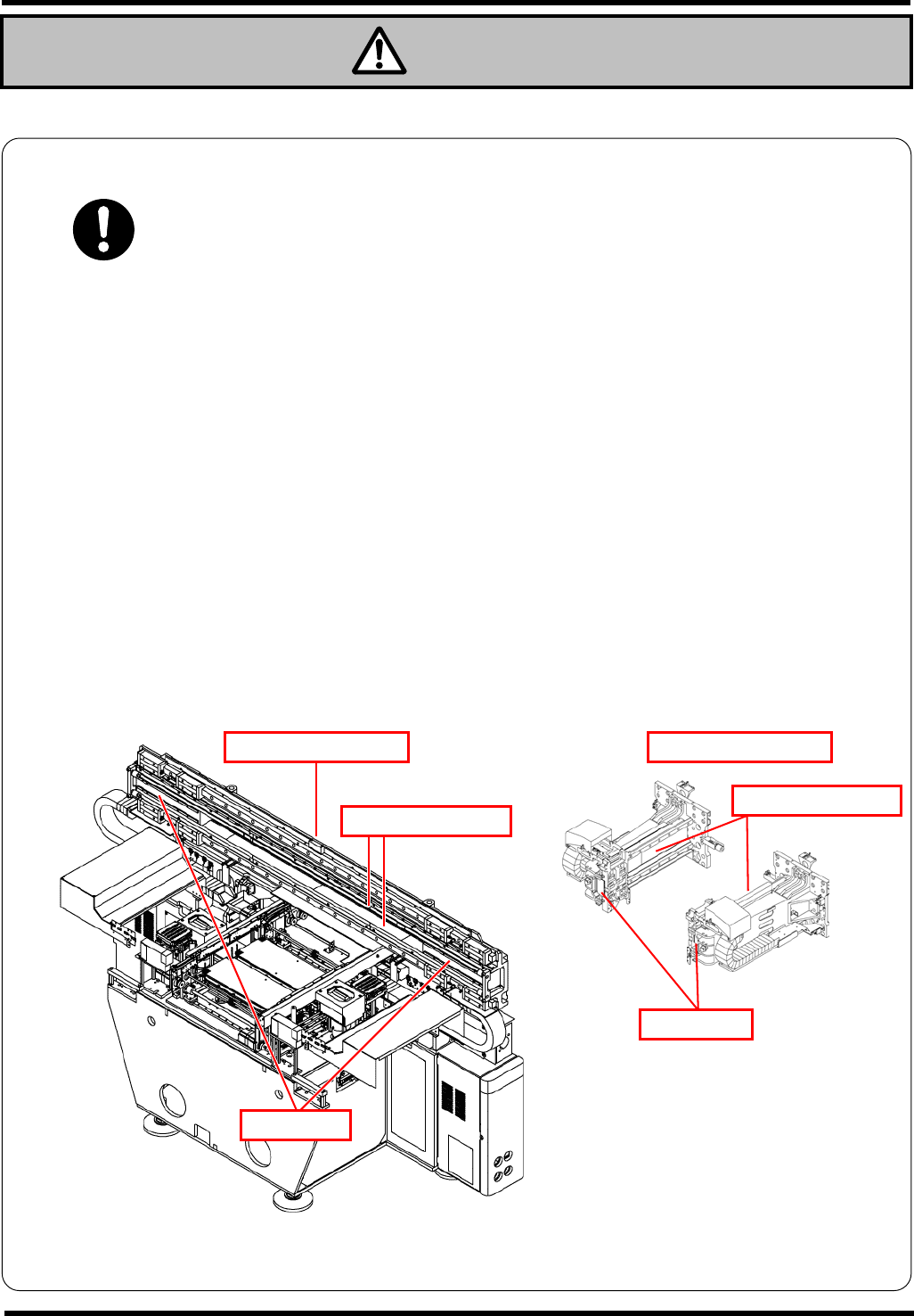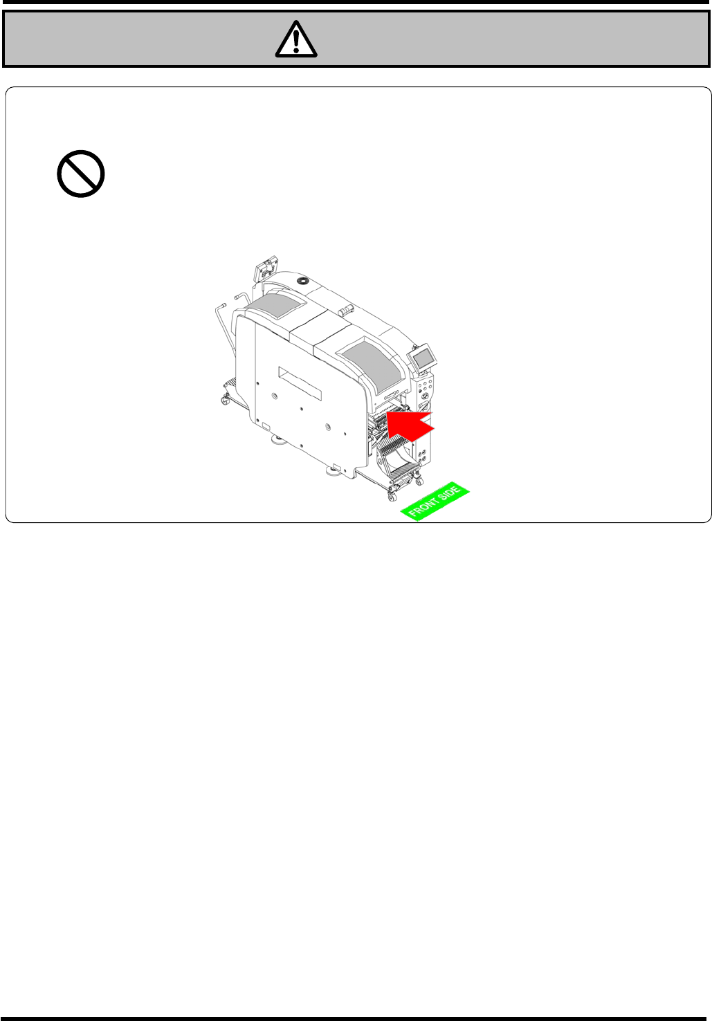 NPM 服务手册 EN1SCC-01-030-C0 SAFETY -7 不要将手放进供料器搭载台上的间隙里 机器内部的可动部有可能伤害到手。 禁止 为了防止将手放进机器内部,推荐在 台车上将所有供料器都设置好。 警告 EJM9B-AK00