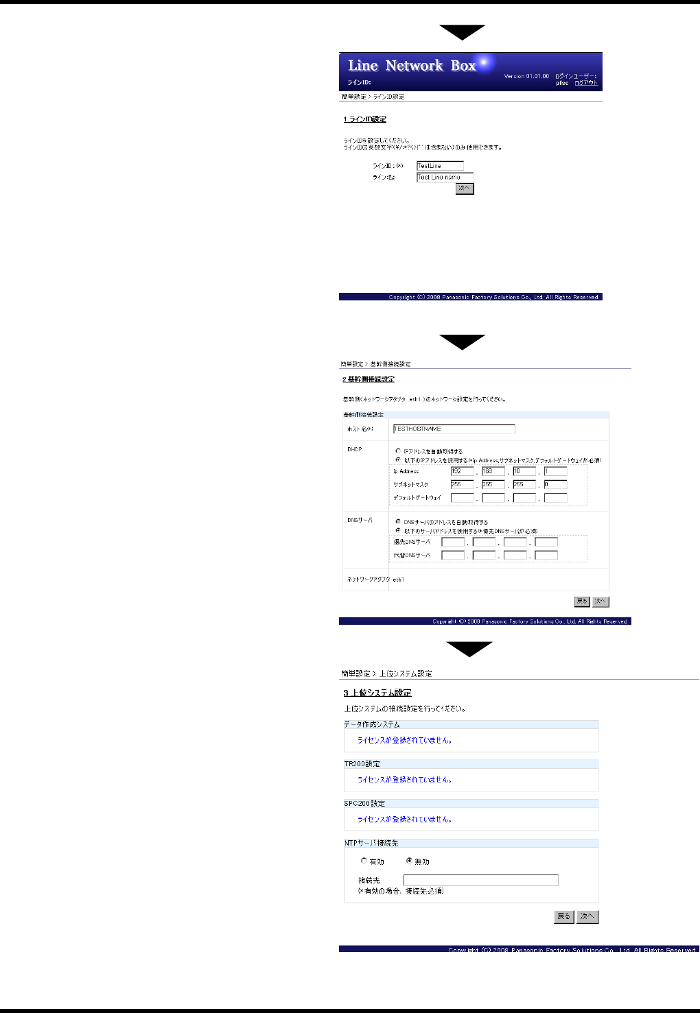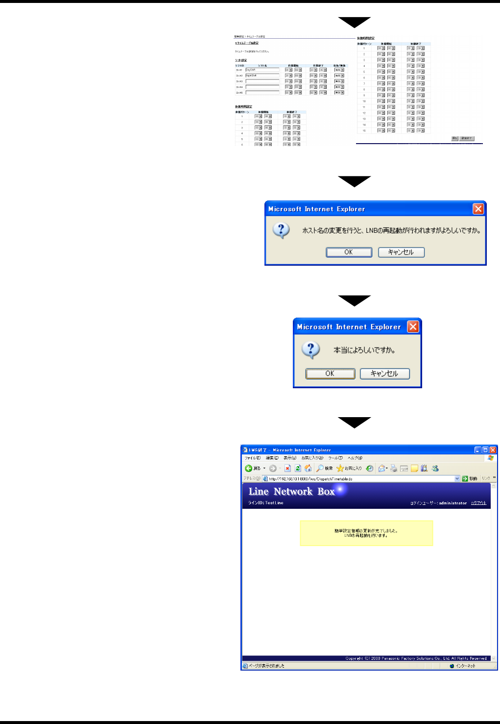 NPM 服务手册 7.4 LNB 的初始设定 EN1SCC-62-040-B0 7.4-6 10. 设定好时刻表, 并将滚动条向下滚动后, 按 下 [ 设定完成 ] 。 ※ 如果没有设定,直接按下 [ 设定完成 ] 11. 如果在第 8 步 骤的网络设定画面中已变更 LNB 的主机名, 就会显示左边的对话框。 按 下 [OK] ,就会继续显示下一个画面。 12. 系统会弹出最终确认对 话框,请按下 [OK] 。 13. 设定已完成了。 …