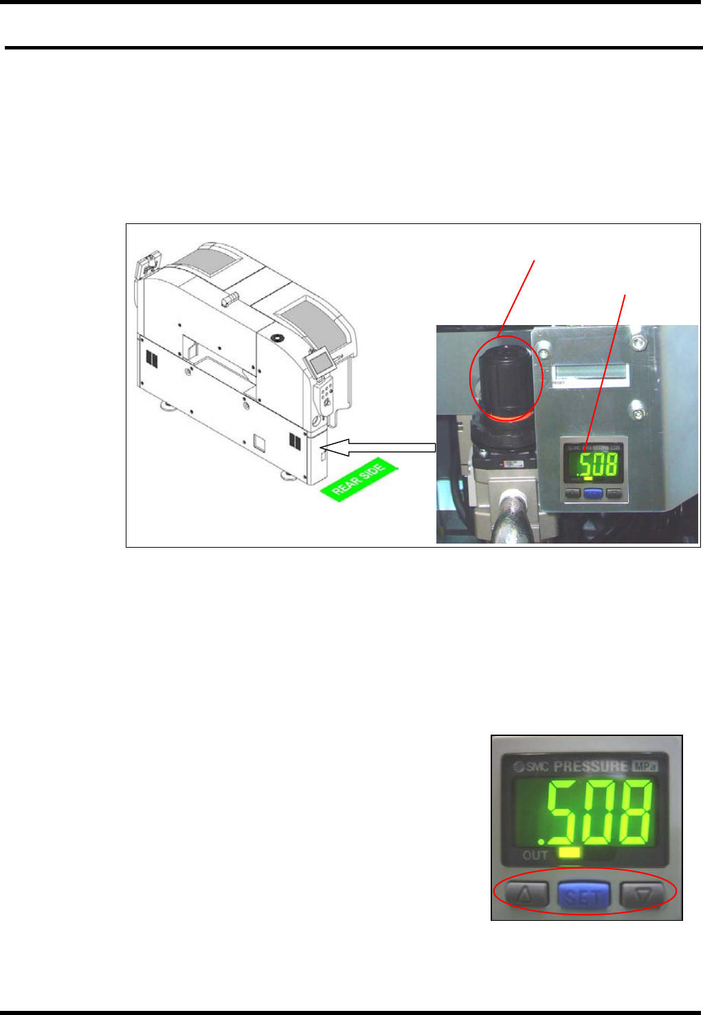 NPM 服务手册 2.2 空气压力的设定 EN1SCC-11-050-B0 2.2-1 2.2. 空气压力的设定 EN1SCC-11-050-B0 2.2.1 主空气压力的调整 主空气压力的确认和调整 1. 将电源置于 ON ,确认压力表的数值。 ( 图 1) = 基准值 = 主空气压力 : 0.5 ~ 0.55Mpa 2. 正常的空气压力未被供给时 ,转动调节器的空气压力调整旋钮进 行调整。 2. 空气压力检测值的设定 = 注…