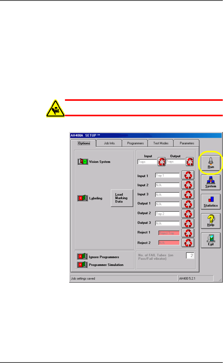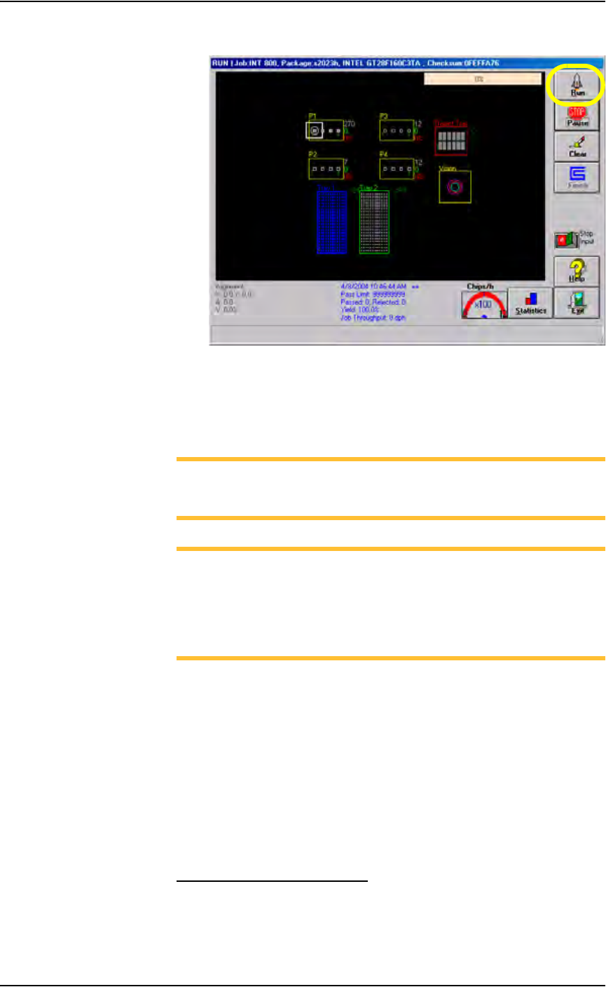Operation • Operator Functions 3—10 PS288 Owner’s Manual 2. On the Run window , click Run . Figur e 3-16— Click Run on the Run wind ow The PNP head moves to the Park positio n and then starts the Job. S tatus indicators …