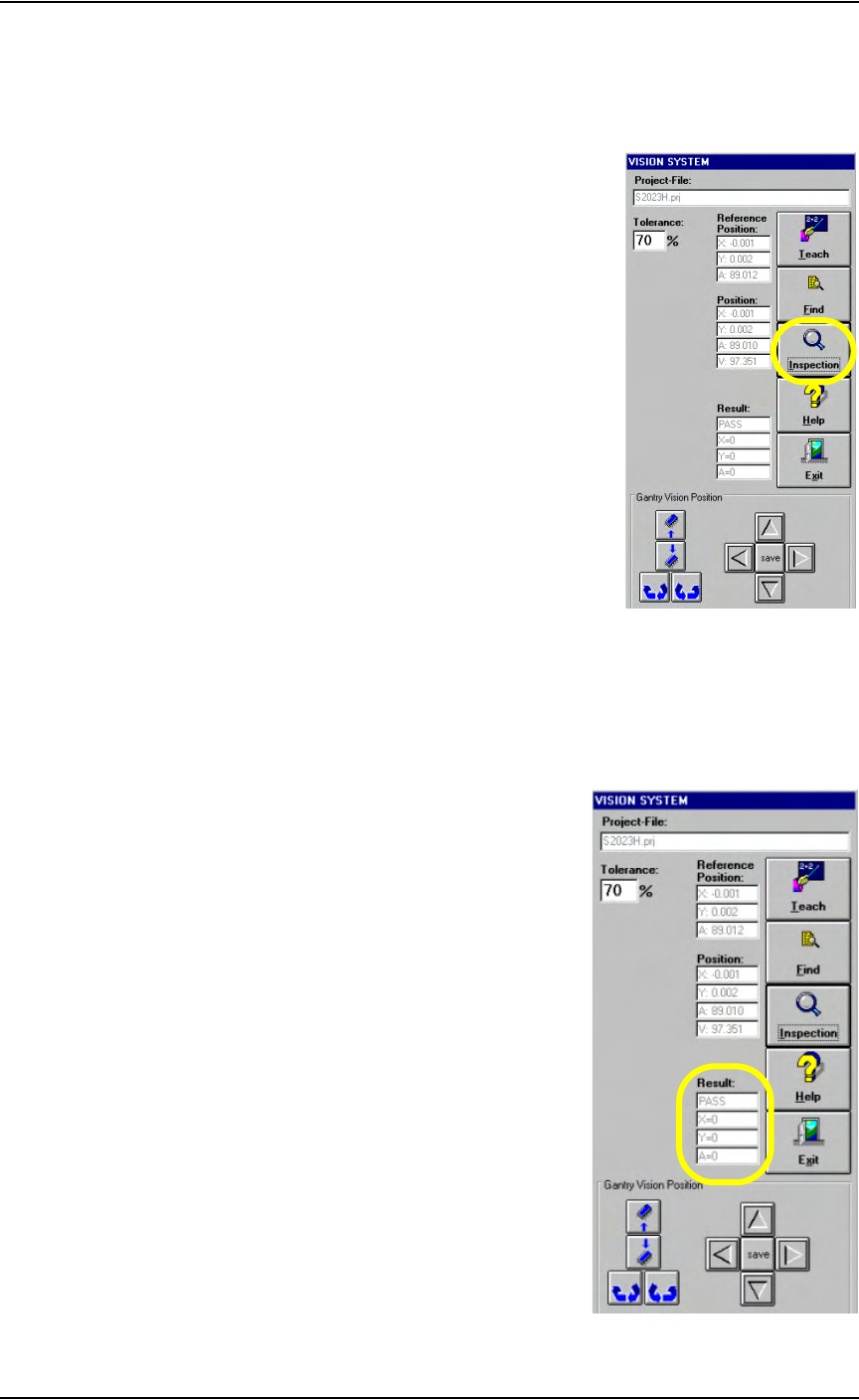 Operation • Administrator Functi ons PS288 Owner’s Manual 3—31 10d) Check new Refer ence Position and V erification values. 1 1. Inspect— 11 a ) Cl i c k Inspection on the V i sion System window . Figur e 3-43— Click Ins…