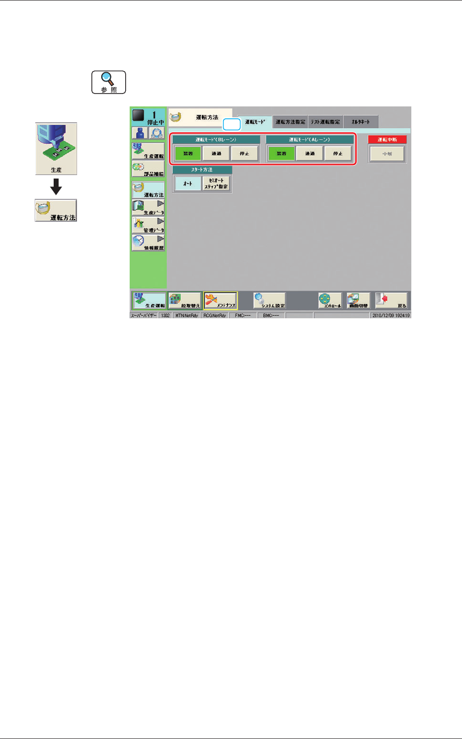 “生産運転”画面の上部“状態表示”に、切替えた運転モードが表示