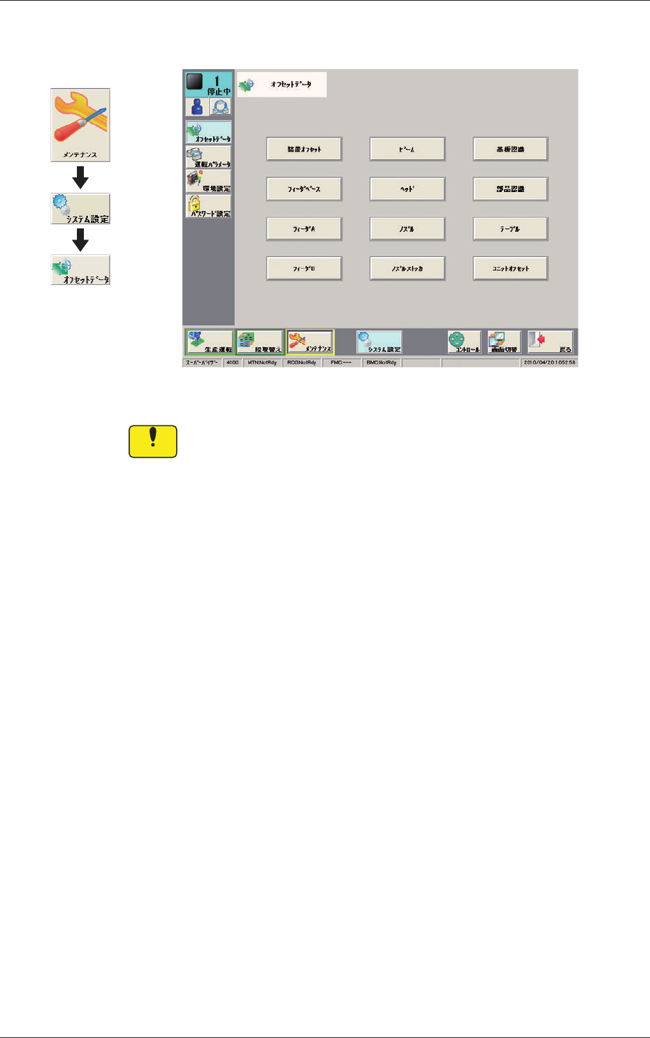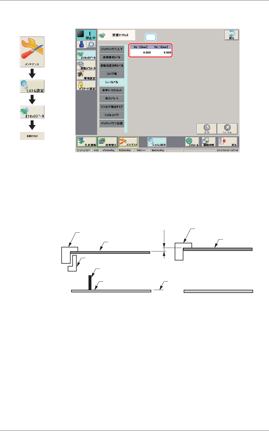 23 OM-1682 12.1 シュートレベル 1 101-001 12.1 シュートレベル [1] Fig. 23 シュートレベル [1] シュートレベル A レーン、B レーン [mm] シングルモードで、サイズが 290mm を超える場合、レーン間の位置 決め高さの差を調整するためのオフセットです。 A レーンシュート上面 基 板 (-) (+) バックアップピン バックアップベース 差分 A-BL B-BL B レーンシュート…