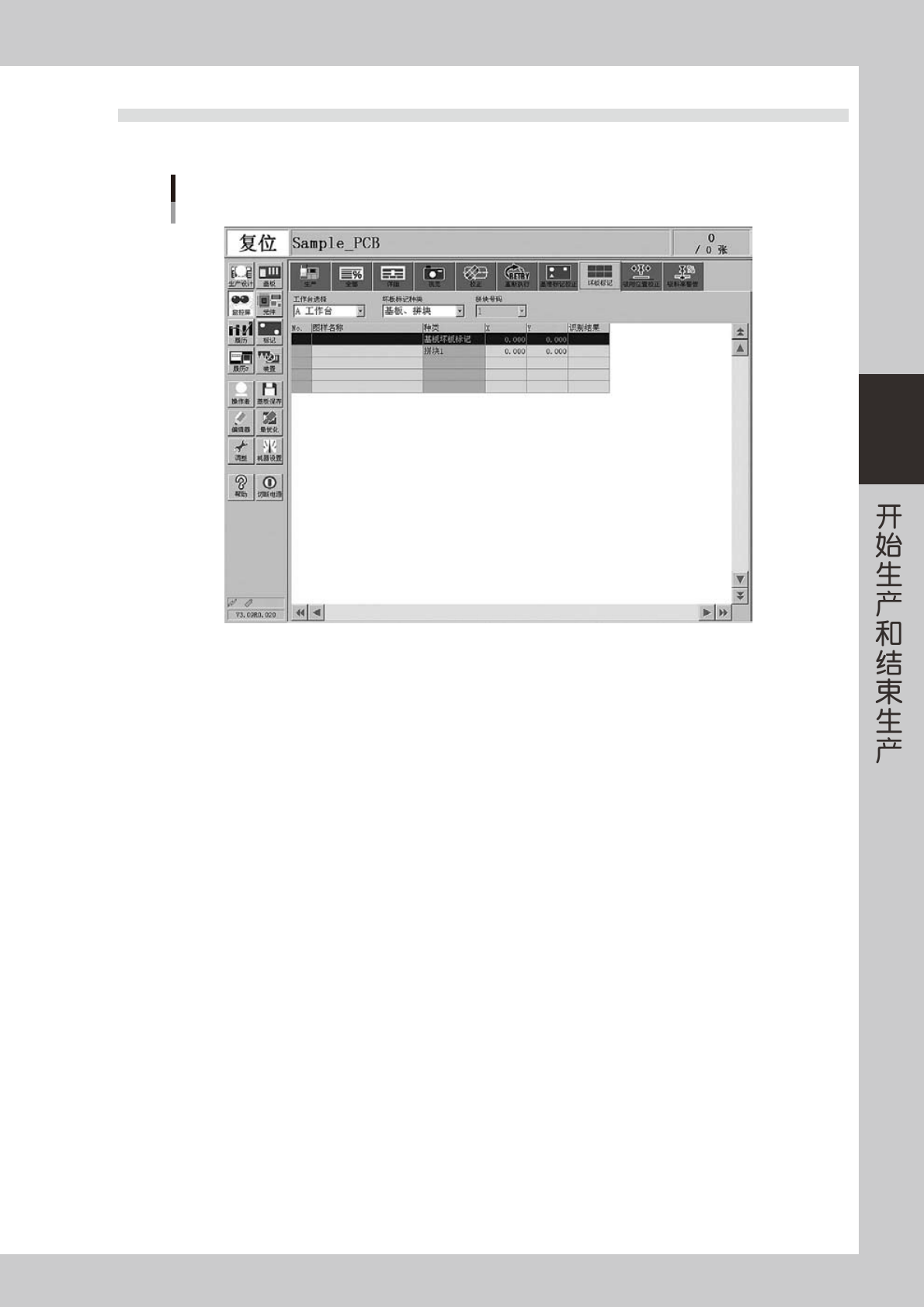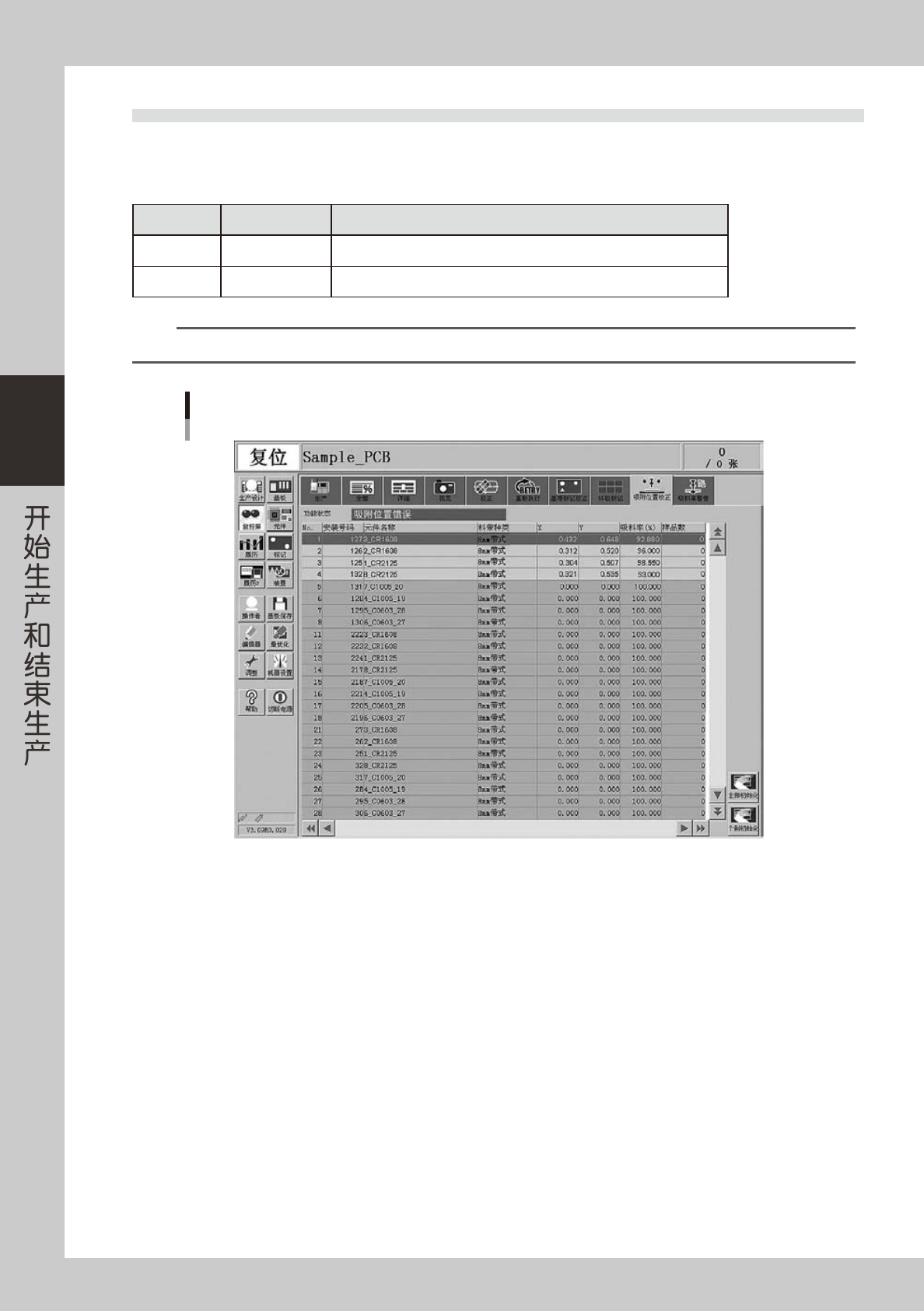 3-22 3 3.9 吸附位置校正 此画面在使用吸附位置校正功能时使用。通过画面可以确认对象元件是如何被校正的。一旦进入 X、Y 方向中任何 一方设置的校正量警告区域或错误区域,监控屏会立即变更显示颜色。监控屏的显示颜色如下表所示。 ■ 显示颜色表 行的颜色 状态 内容 黄色 警告 已经超出在吸附位置校正规格中设置的各吸嘴数据警告级别值。 红色 错误 已经超出在吸附位置校正规格中设置的各吸嘴数据错误级别值。 n 要点 吸附位置校正规格…