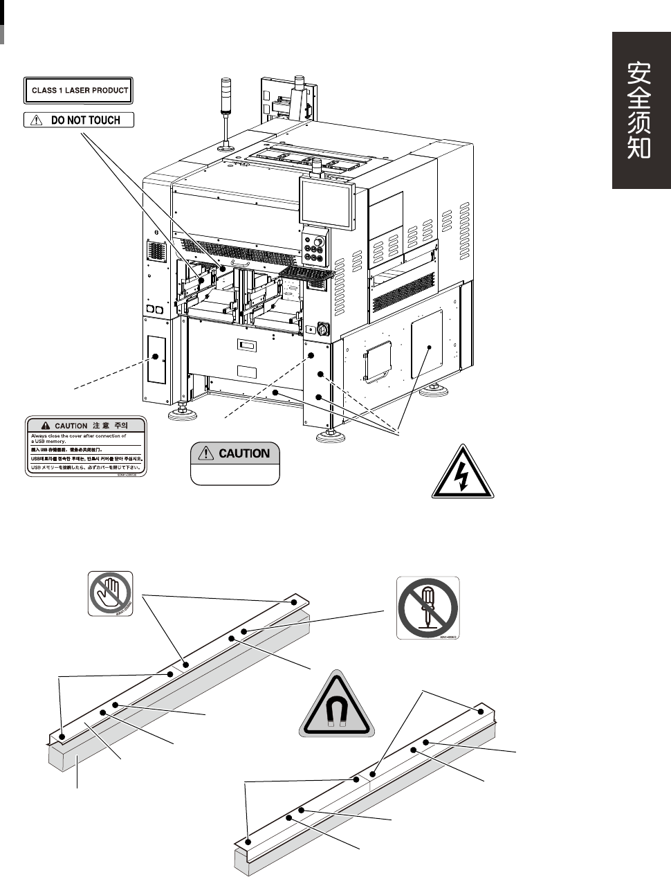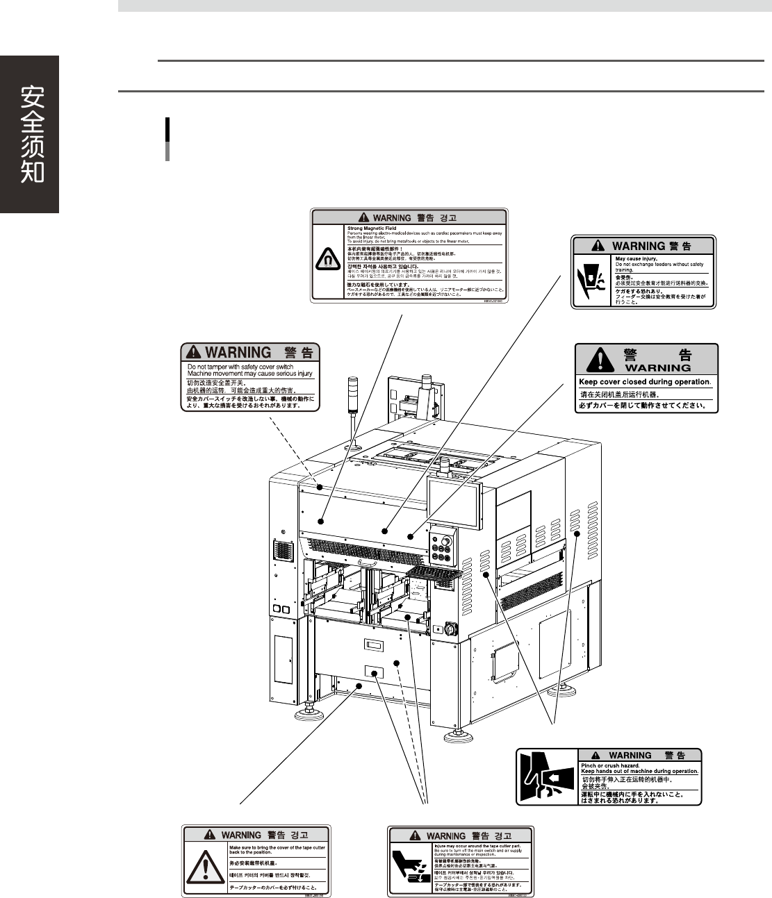 为了安全使用机器,如下图所示,在贴片机各个部位张贴了警告标贴,务必严格遵守标贴指示。