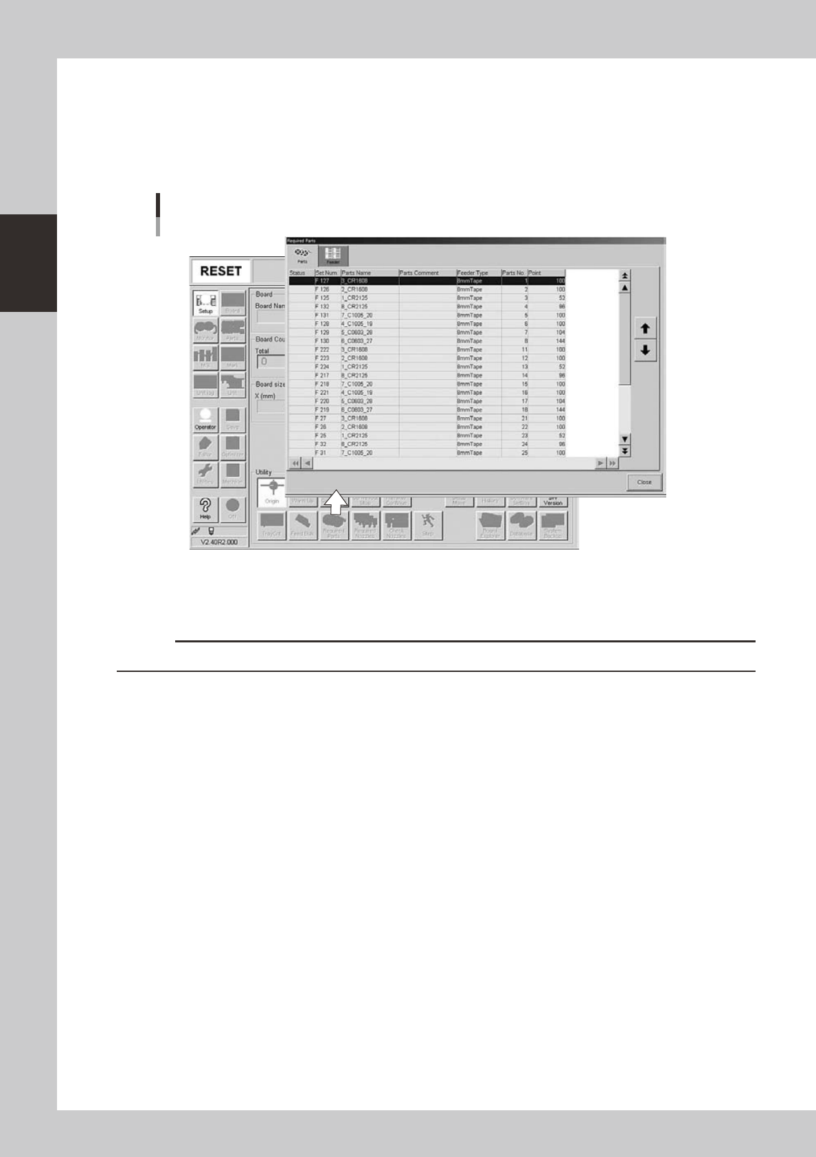 On the [Setup] screen, press the [Required Parts] button to open the "Required Parts" screen and check