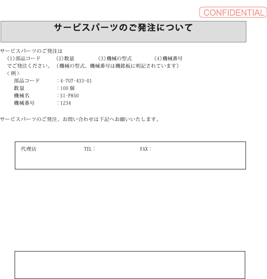 2 For order of Service p ar ts Please order service parts with the following information ; (1) Parts code (2) Q´t y (3) Model name of machin e (4) Serial No. of machin e < example. > Parts cod e : 4-707-433-0 1 Q´t…