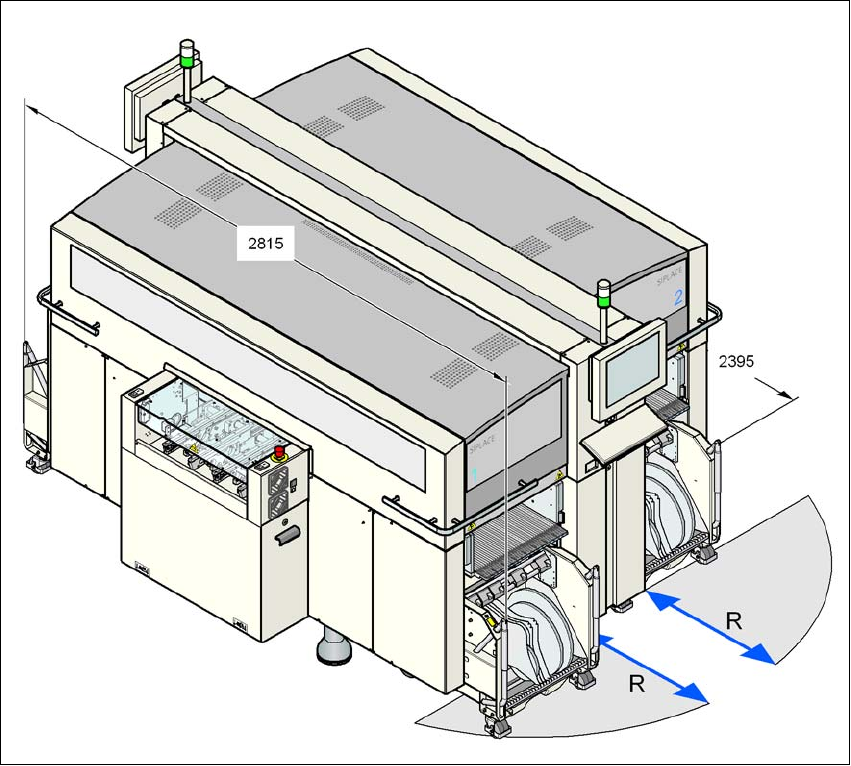 사용자 매뉴얼 SIPLACE X 시리즈 3 장비 기술 데이타 소프트웨어 버전 SR.70x.xx 에서 2 011 년 1 월 한국 판 3.3 크기 및 무게 117 3.3.4.3 X3 실장기의 컴포넌트 트롤 리 조종 거리 3 3 그림 3.3 - 8 X3 실장기의 컴포넌트 트롤리 조종 거리 X3 실장기 의 컴포넌트 트롤리 조종 거리 R 은 다음과 같습니다 . - 위치 1, 3 및 4 750mm ,손…