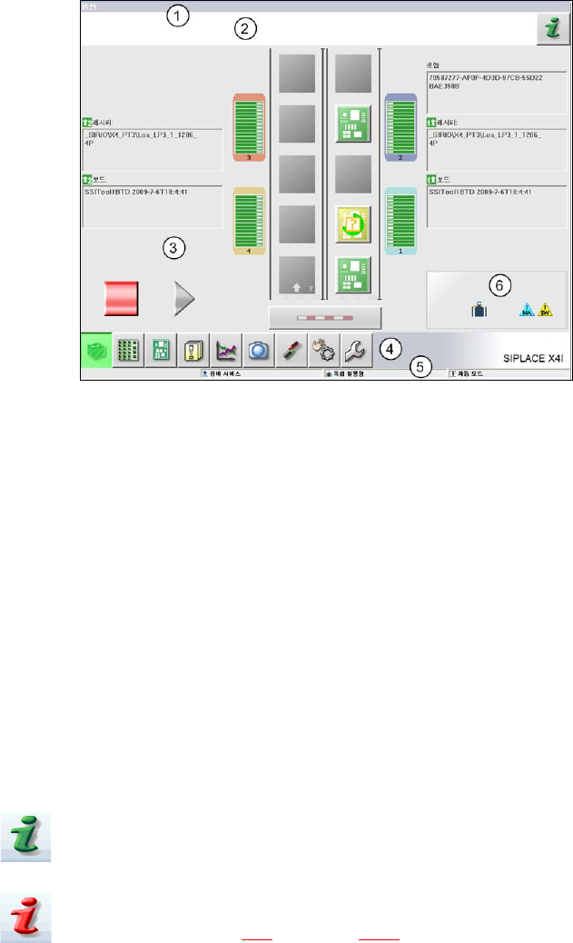사용자 매뉴얼 SIPLACE X 시리즈 5 장비의 사용 소프트웨어 버전 SR.70x.xx 에서 2 011 년 1 월 한국 판 5.5 사용자 인터페이스 307 5.5 사용자 인터페이스 사용자 인터페이스는 다음과 같은 영역으로 나눠집니다 . 예시로 여기에서 X4I 실장기 " 기본 생산 " 에 있는 사용자 인터페이스를 볼 수 있습니다 . 그림 5.5 - 1 " 기본 생산…