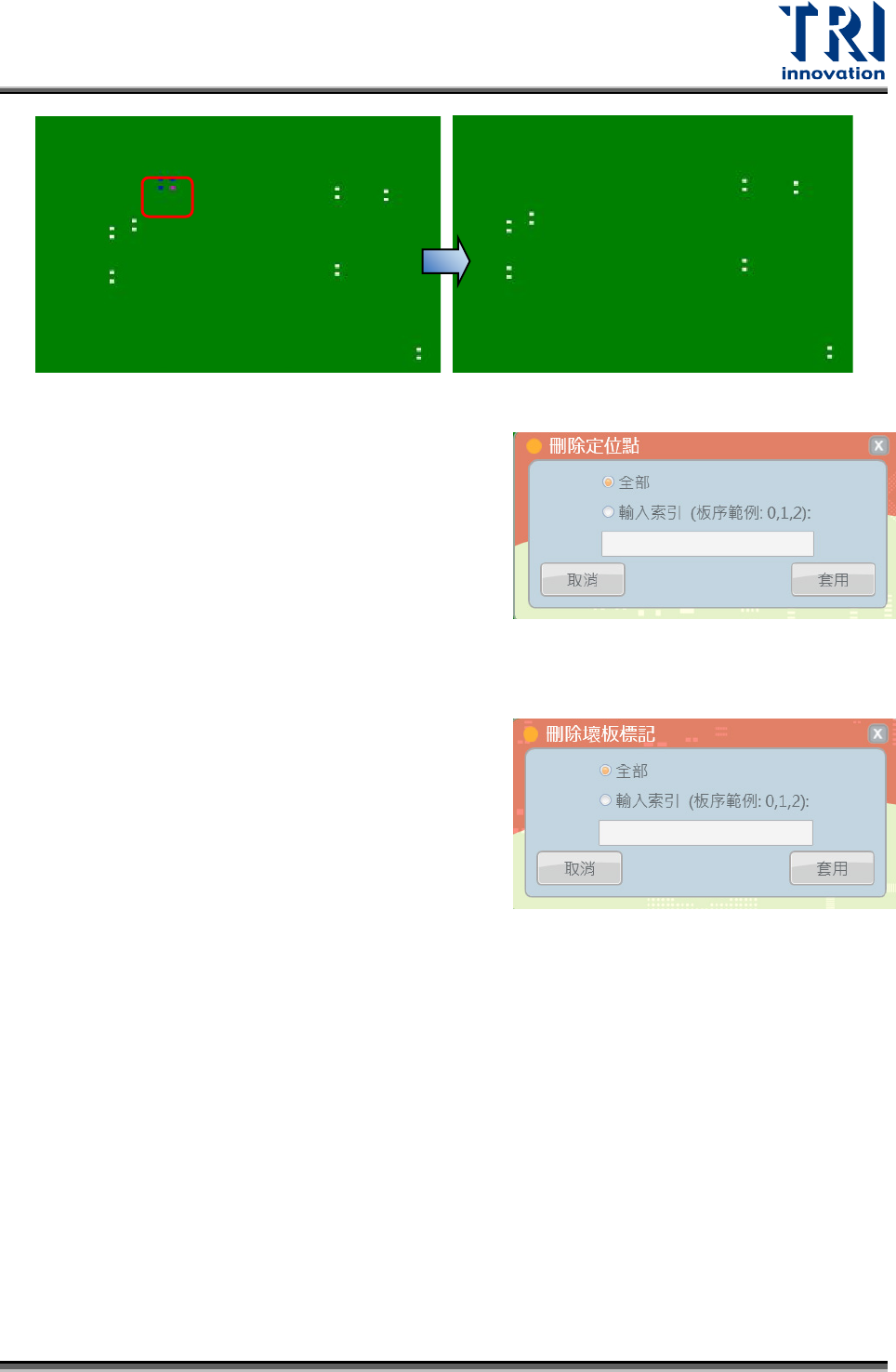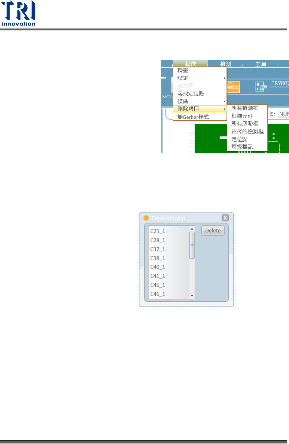 Test Research, Inc. 96 TR 7007 User Guide – Softwa re 4.2.5 刪除項目 刪除不必要的檢測框,可選擇直接刪除全部檢 測框、依元件刪除、刪除忽略的檢測框或者目 前所框選的檢測框,也可刪除定位點或壞板標 記。 < 所有檢測框 > 刪除所有的檢測框。 < 根據元件 > 依元件刪除,從元件列表之中選擇 要刪除的元件,選定後點選 [ Delete ] 鈕。 < …