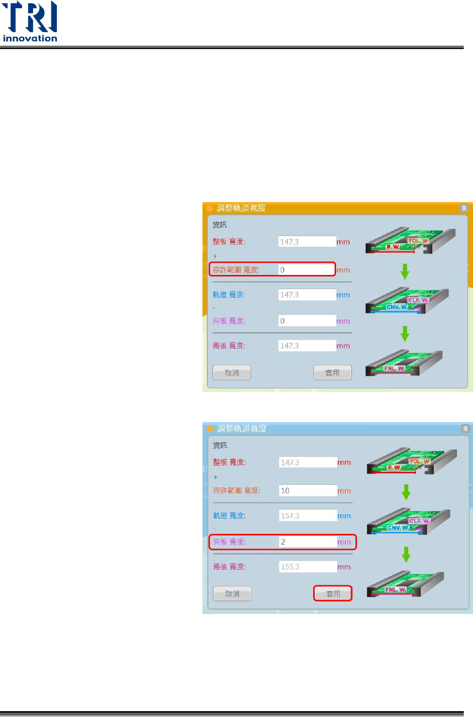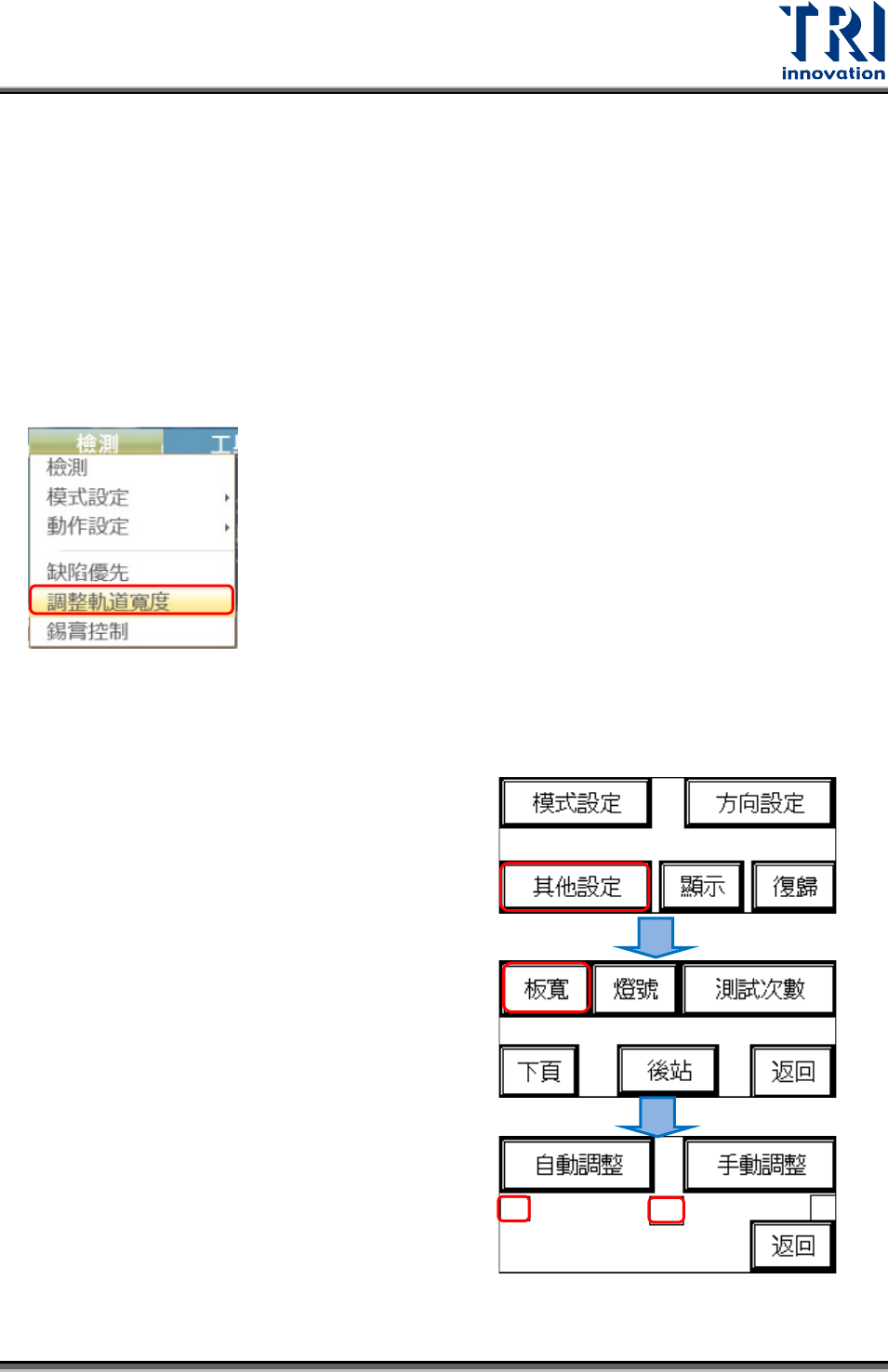 Test Research, Inc. TR 7007 User Guide – Softwa re 99 4.3.4 自動板寬 若有選配自動板寬功能,則可設定自動板寬其夾板間隙等細項,設定如下所述: 下圖中的選項在一般狀態下不會出現,除非有在 HCI 介面中設定板寬自動調整才會出 現。 <HCI 設定 > Step.1 點擊 [ 其他設定 ] 。 Step.2 點擊 [ 板寬 ] 。 Step.3 點擊畫面中紅框部分