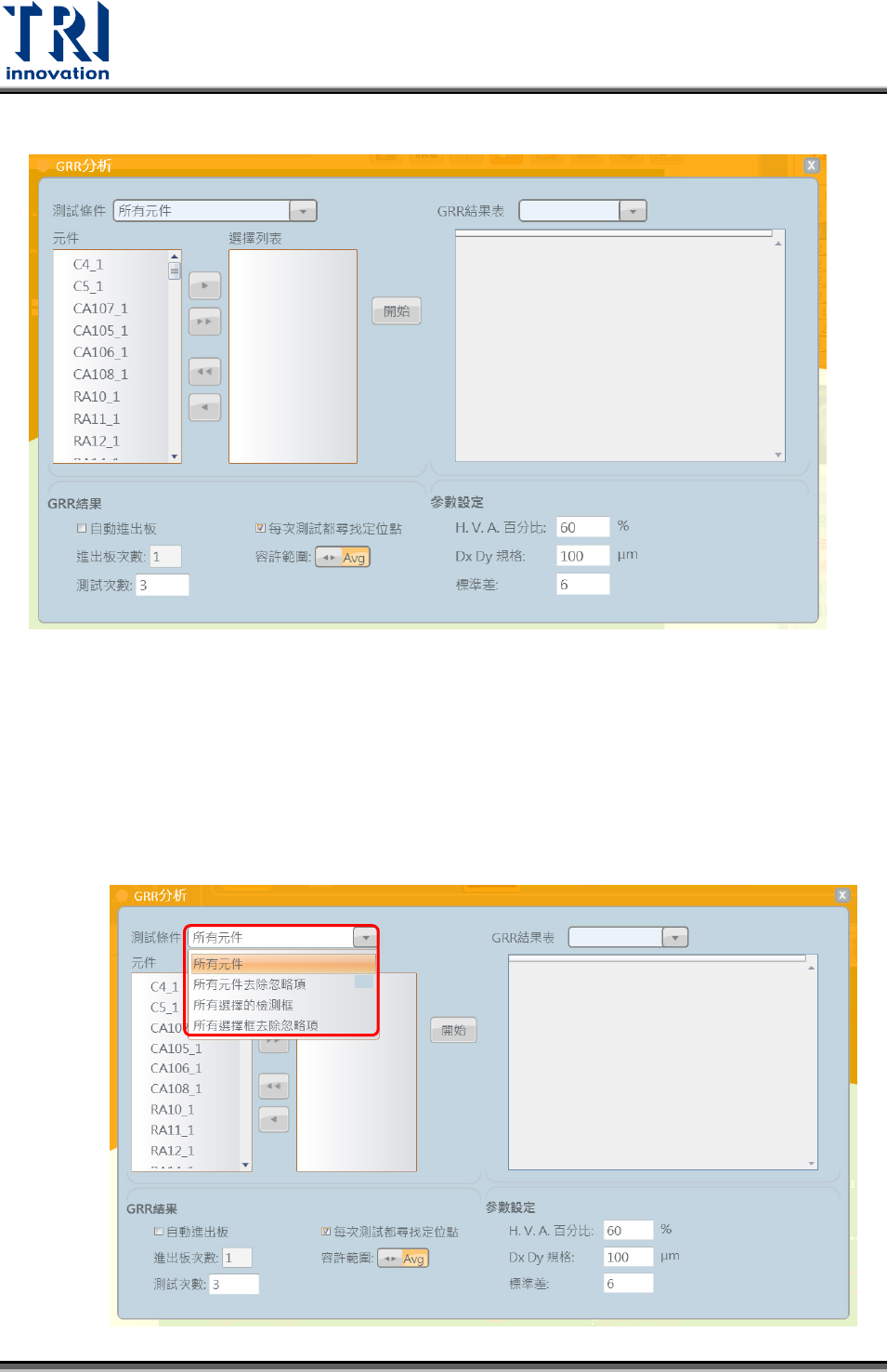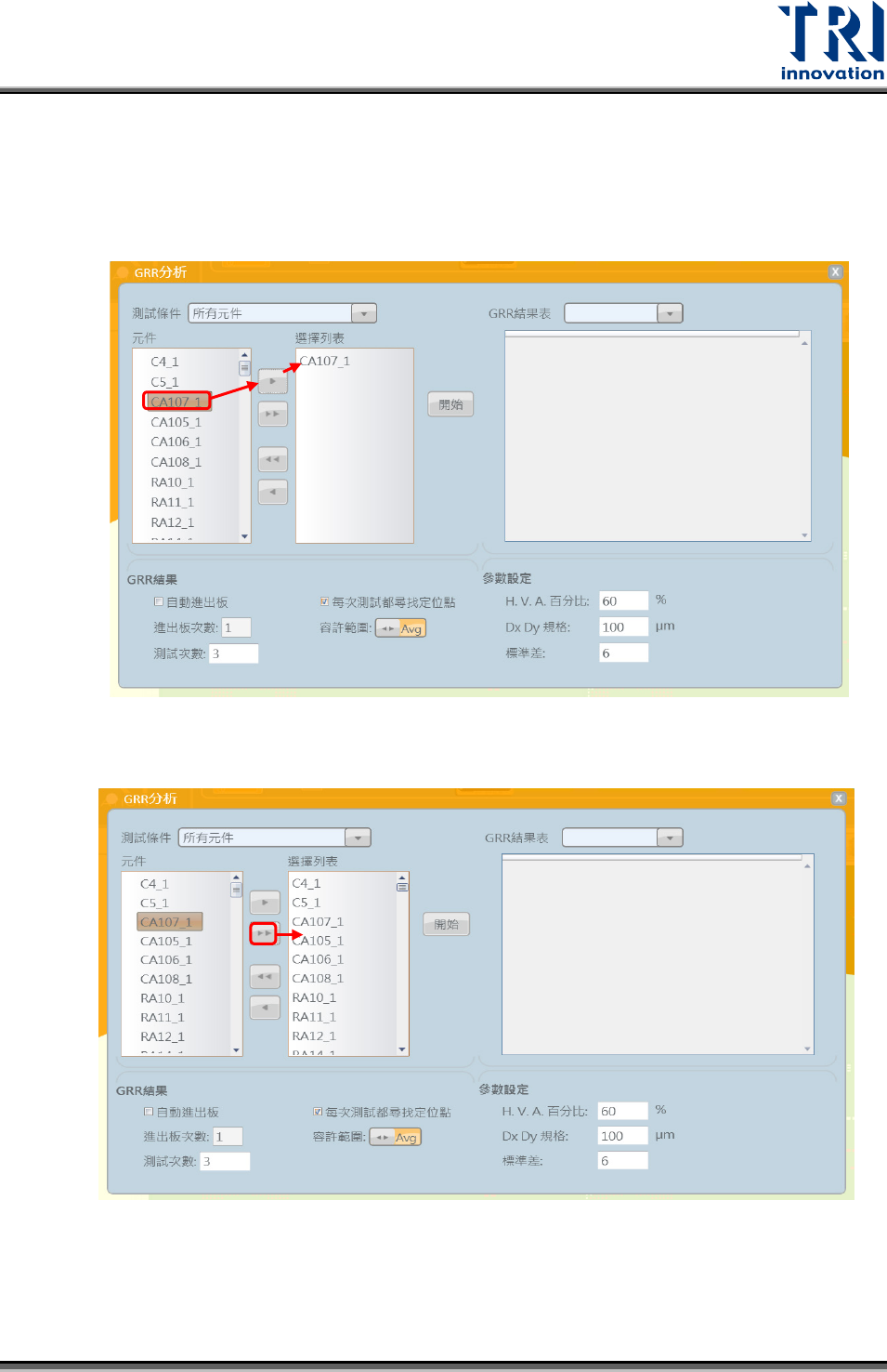 Test Research, Inc. TR 7007 User Guide – Softwa re 107 Step.2 選擇測試錫膏:可單一錫膏挑選或直接全選 ( 單一元件挑選 ) ( 直接全選 ) Step.3 GRR 測試設定:可設定進出板次數與每次進板檢測次數,下圖表示了兩種情 況,左圖並未勾選 [ 自動進出板 ] 代表不進出板,右圖代表有進出板。