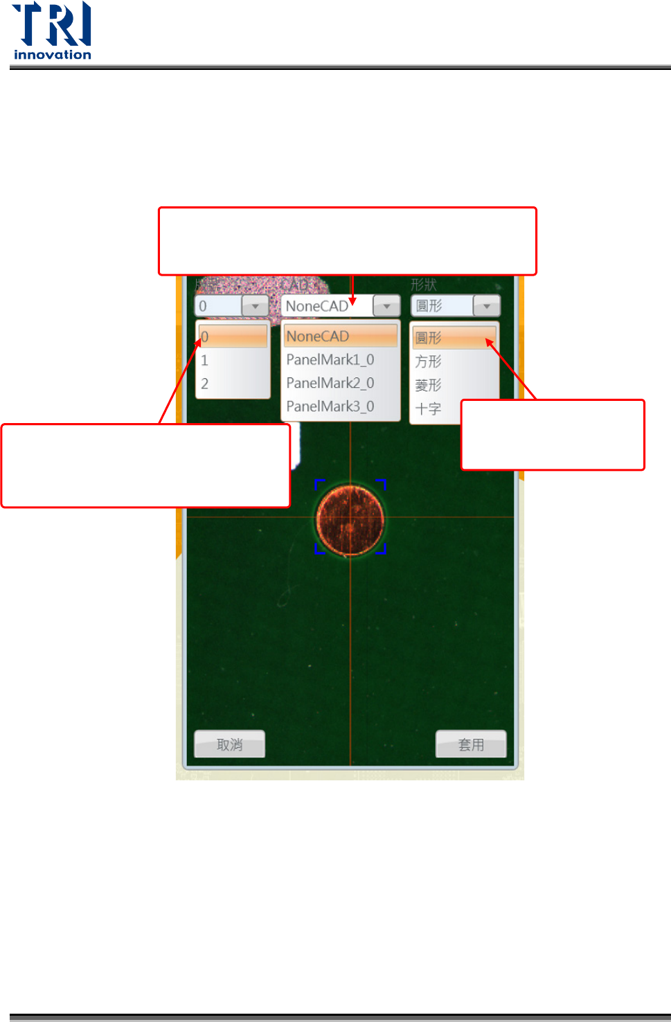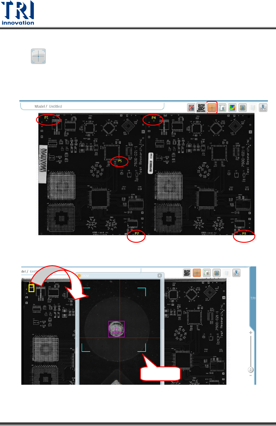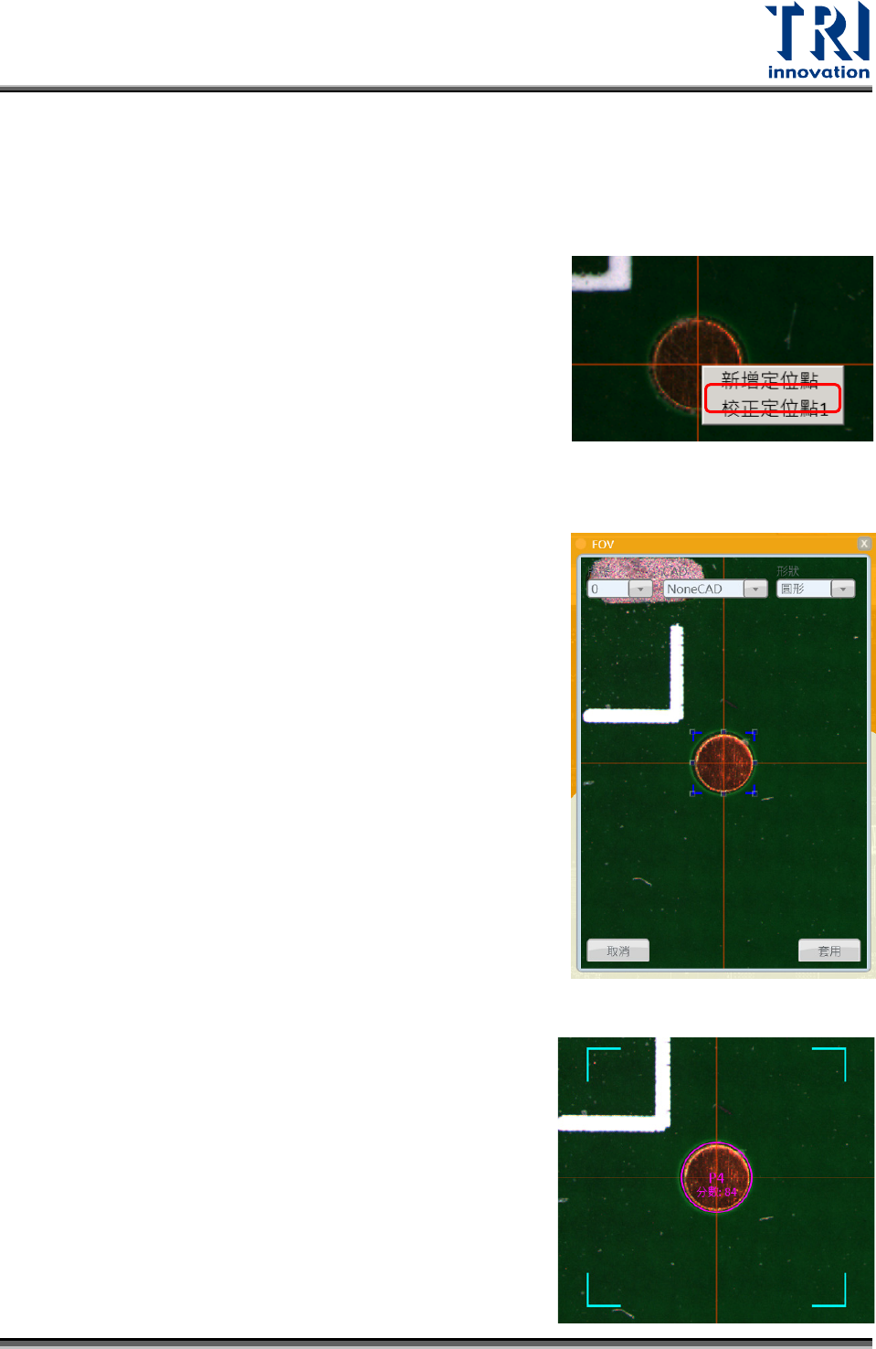 Test Research, Inc. TR 7007 User Guide – Softwa re 45 < 新增對位點 > 在 FOV 新增對位點設定順序如下: Step.1 在 FO V 中點擊右鍵。 Step.2 選擇 [ 新增定位點 ] 。 Step.3 調整藍色方框至與對位點貼合,讓藍色方框 的中心對準對位點的中心。 Step.4 選擇對位點的形狀。 Step.5 點擊 [ 套用 ] 。 Step.6 當新增對位…
