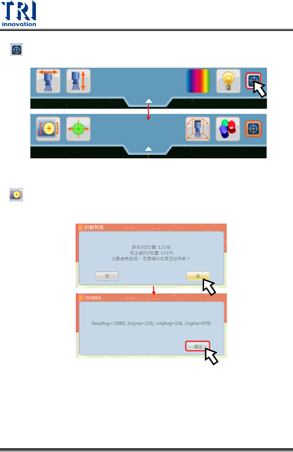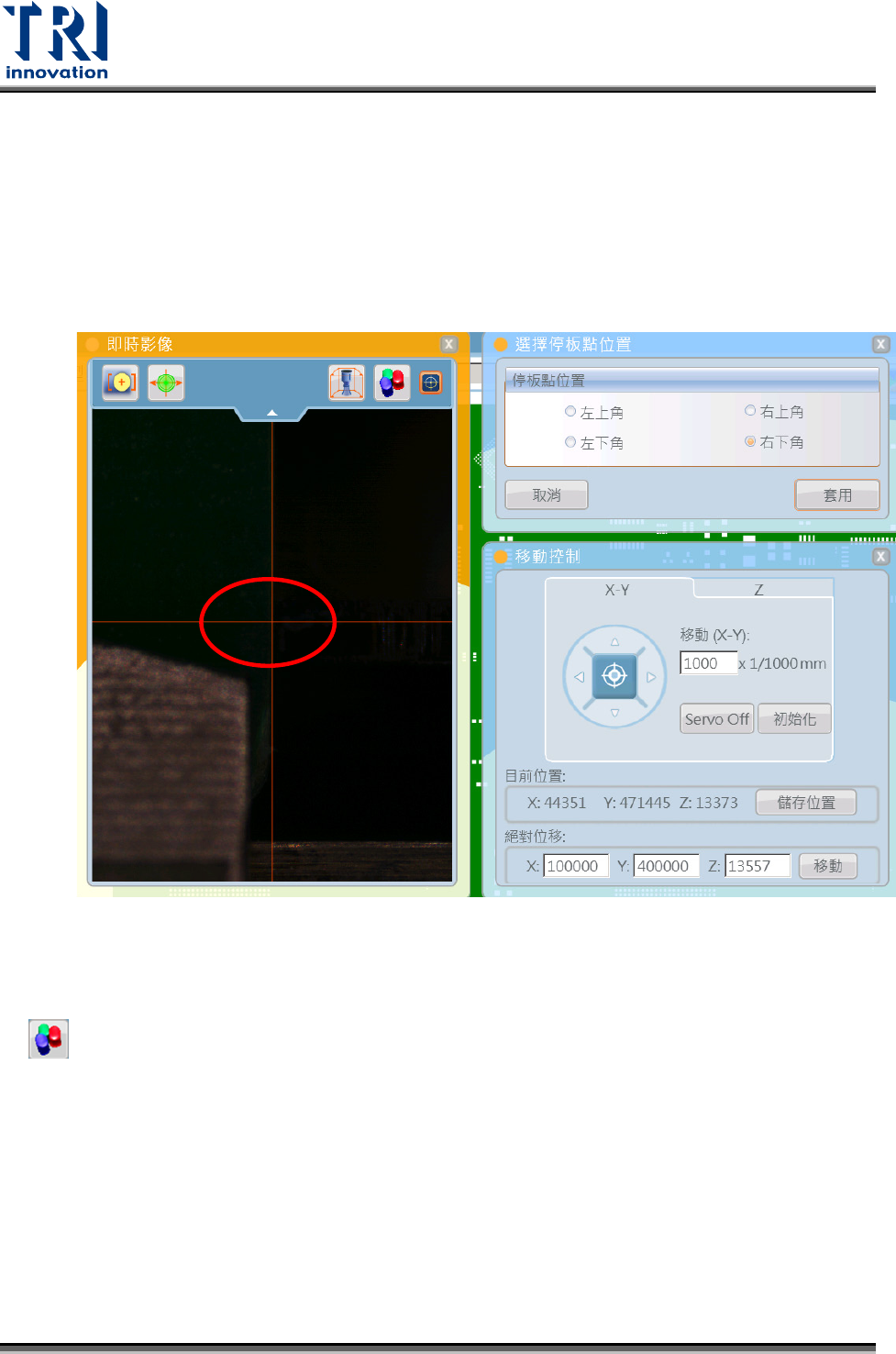 校正測距感應器 X 和 Y 軸偏移量,將鏡頭移到板子右上角並點選此功能,系統