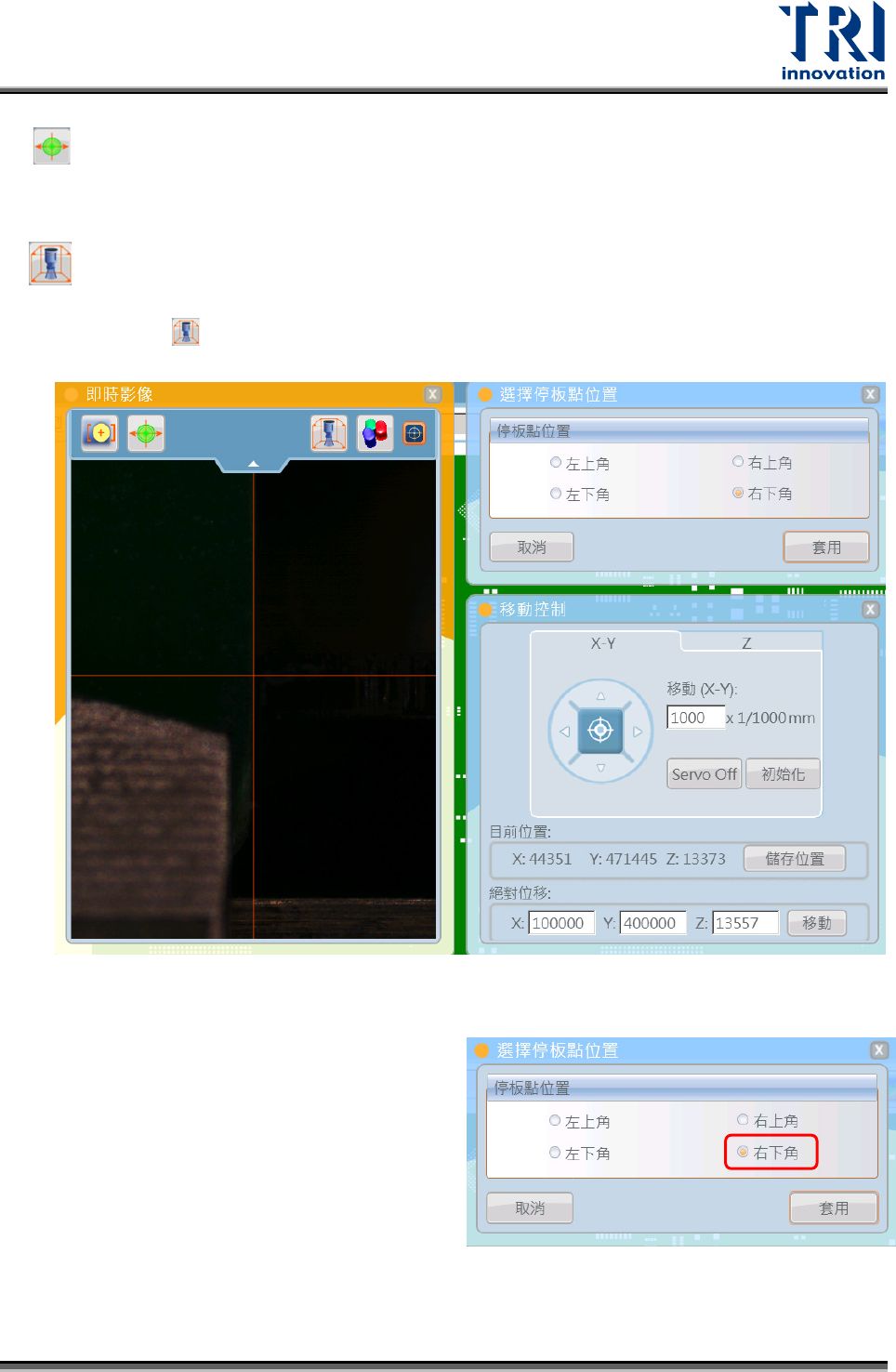 Test Research, Inc. TR 7007 User Guide – Softwa re 63 校正測距感應器 X 和 Y 軸偏移量,將鏡頭移到板子右上角並點選此功能,系統 會自動校正測距感應器。 停板位置,手動設定停板位置,流程如下所示。 Step.1 點選 [ ] 鍵後停板位置設定視窗跳出如下所示。 Step.2 選擇要把停板位置 設 在 板子的哪 個角落。 ( 左進右出則設右上或 右下,右進 左出則設左上或左下 ) 。