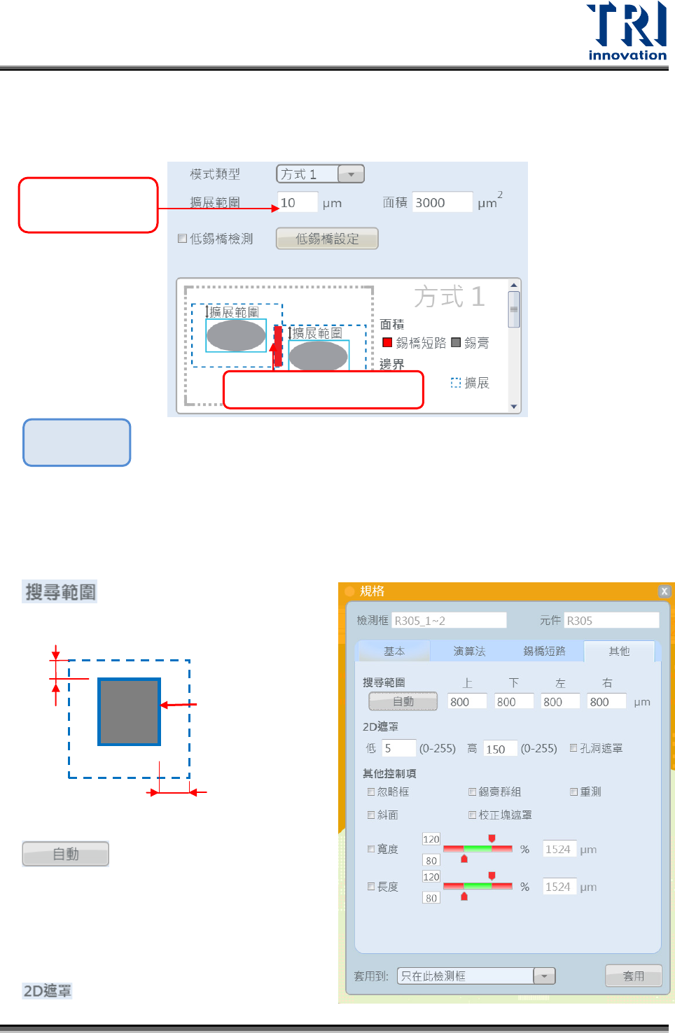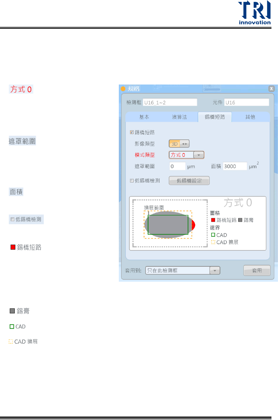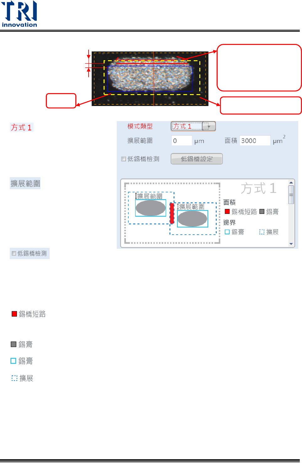 Test Research, Inc. 78 TR 7007 User Guide – Softwa re :代表藉由觀察兩個 相鄰錫點是否有錫膏重疊來 判定是否短路。 :設定要將 B lob 框往外延伸多少距離,此距 離以內都會被認定為是實際 錫膏的區域。 :勾選代表檢測 低錫膏短路。 ( 圖示顏色定義 ) :紅色區域代表藍色虛線重疊的部分,即會用來判定是否有短路的部分。 若有紅色區域代表兩個相鄰錫點有重疊到,判定短路。 :灰色區域代…