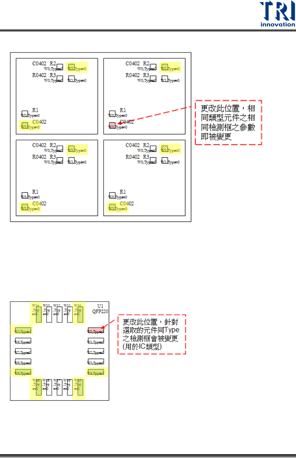 Test Research, Inc. TR 7007 User Guide – Softwa re 83 與這個元件相同類型、相同位置 ( 相對於元件中心 ) 之檢測框 所有選擇的檢測框:所選取之檢測框 所有檢測框:所有檢測框 此元件內相同群組:在這個元件上與最後選取之檢測框具有相同群組的所有檢測框 ( 必須先設定好群組 ) 相同類型內相同群組: 與這個元件相同類型且與最後選取之檢測框相同群組之所有檢測框 ( 必須先設定群組 )