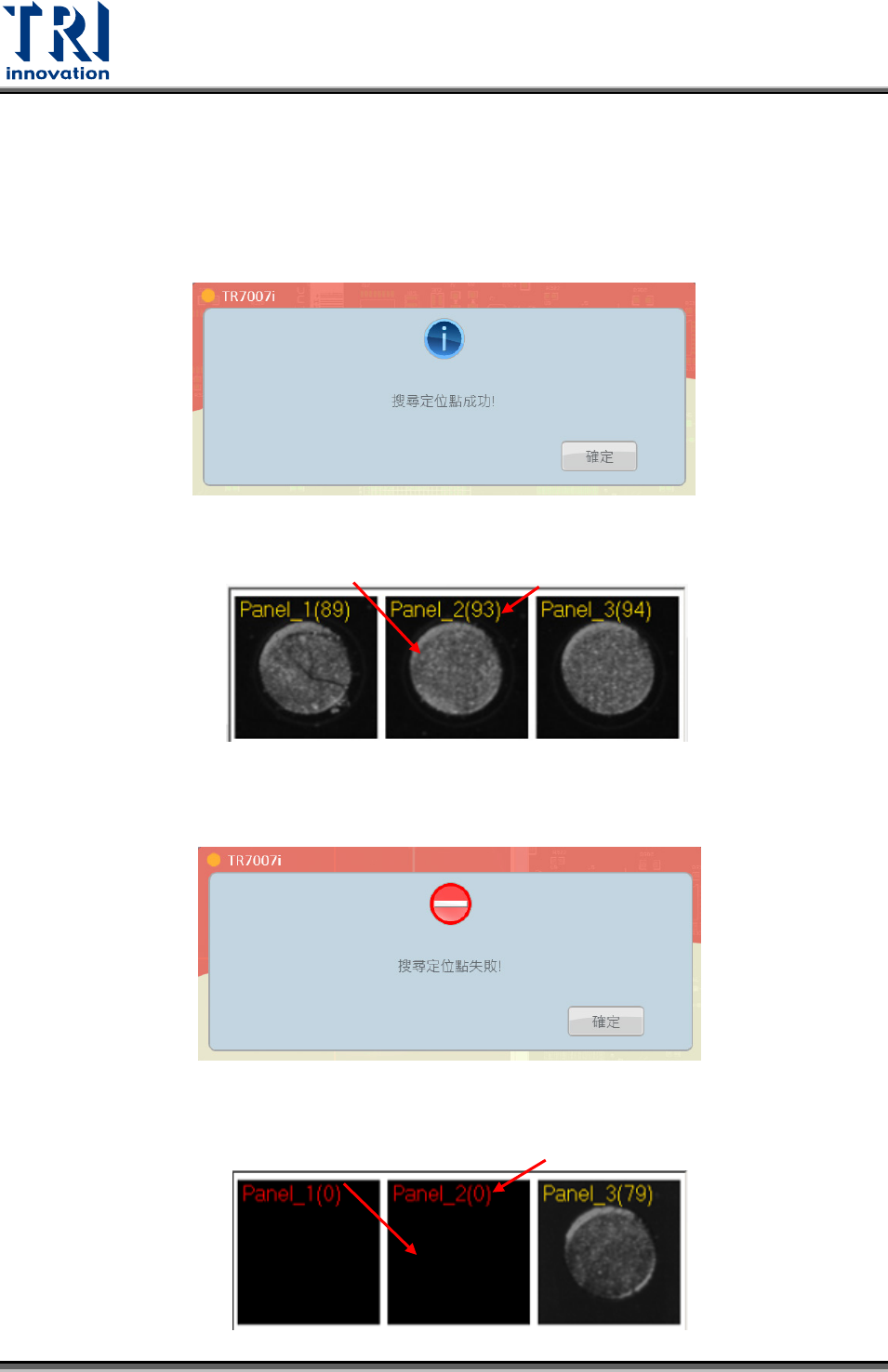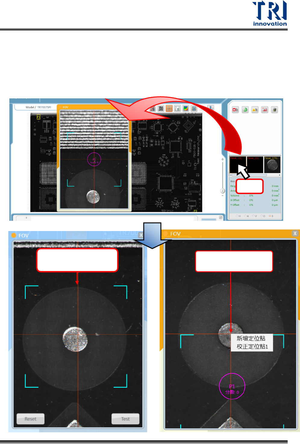 Test Research, Inc. TR 7007 User Guide – Softwa re 89 當定位點搜尋失敗,你可以依照以下步驟調整定位點影像。 Step.1 雙擊不良定位點影像,跳出 FOV 後檢視對位點是否在搜尋範圍內, 或定位點 影像是否不夠清楚。如果定位點不在搜 尋範圍內,可調整搜尋 範圍或直接在定 位點上點右鍵選校正定位點 1 。 雙擊 方式 2 :在該定位點 點右鍵選校正定位點 方式 1 :拖曳搜尋範 圍到定…
