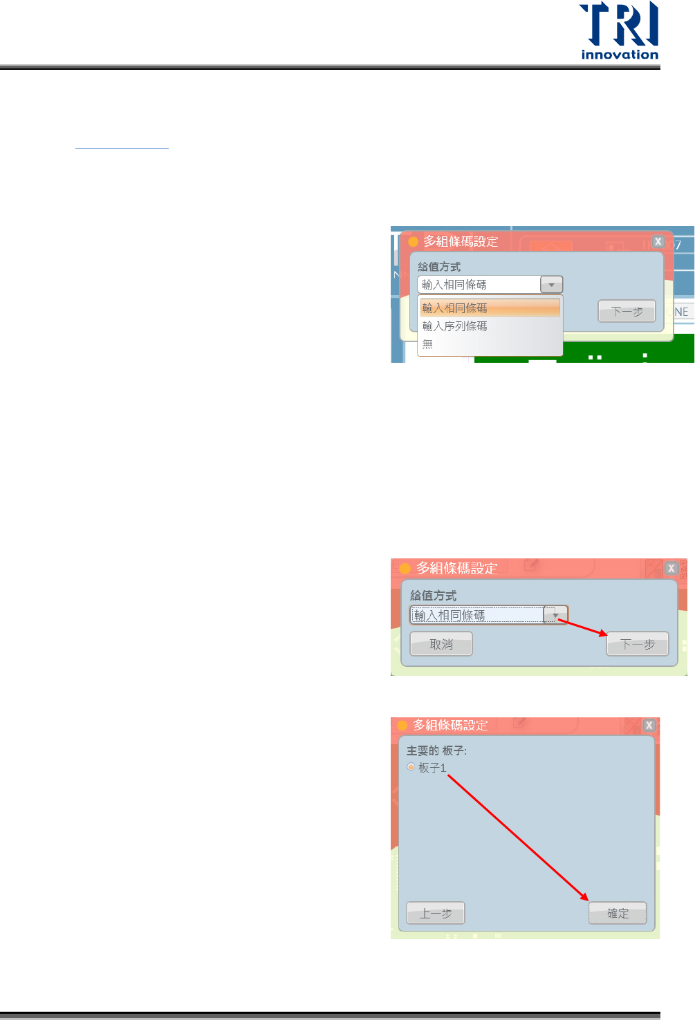 Test Research, Inc. 94 TR 7007 User Guide – Softwa re < 輸入序列條碼 > Step.1 在硬體條碼或軟體條碼設定好條碼。 Step.2 選擇 [ 輸入序列條碼 ] 後點選 [ 下一步 ] 。 Step.3 選擇主要的板 子,若你前面的條碼設定 為兩條以上,便會有其他板子可以選 擇,若只有一個,則只有該板子可被選 為主要的板子如右圖所示。 Step.4 選擇好後點選 [ …
