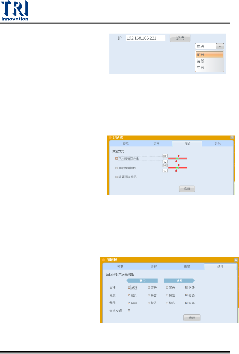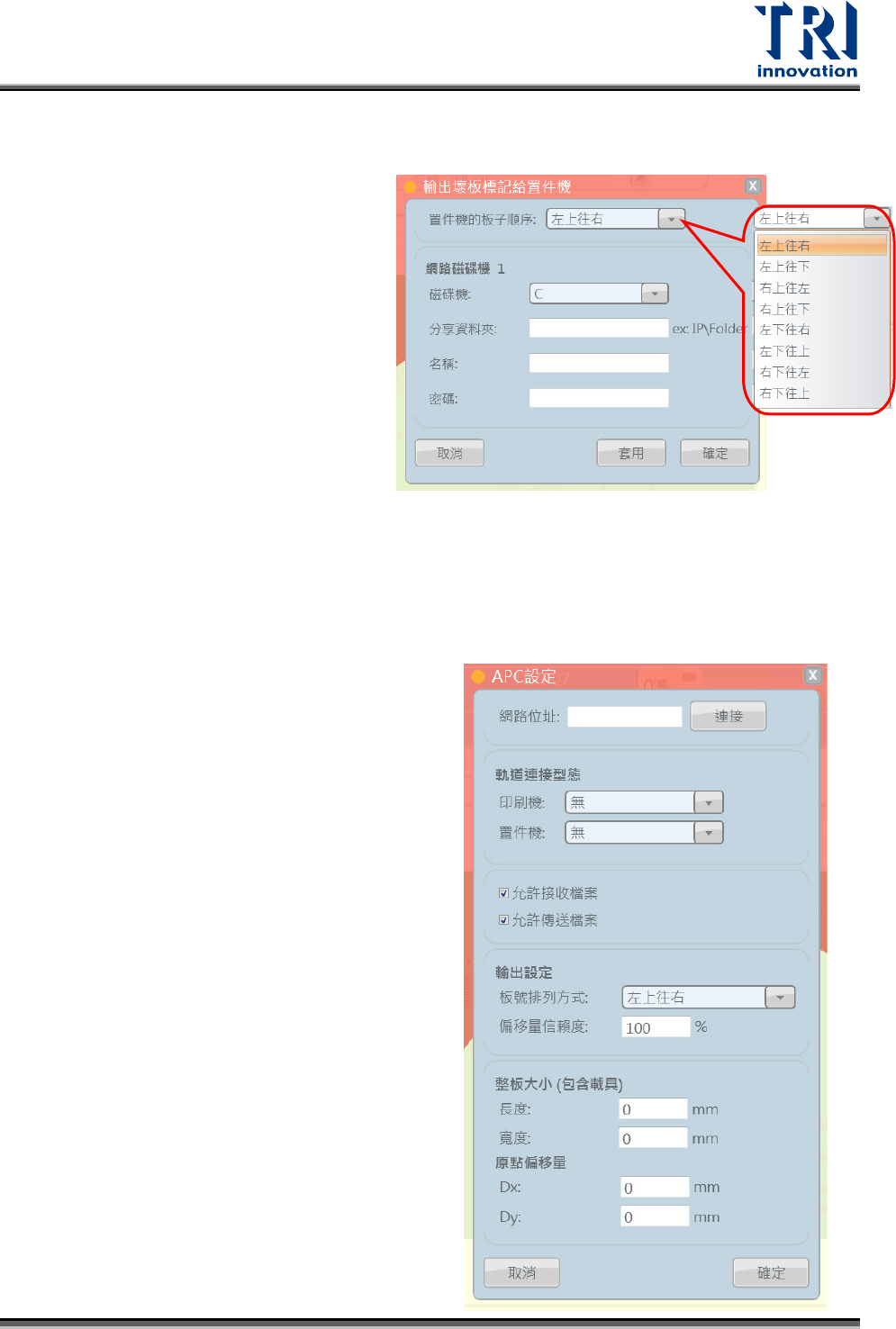 Test Research, Inc. TR 7007 User Guide – Softwa re 125 < 前饋功能設定 > 1. 設定打件機的板子順序。 2. 設定網路磁 碟機,連結到 打件機 的分享資料夾。 3. 設定打件機電腦的名稱與密碼。 <APC 系統 > APC 系統是跟 Panasonic 錫膏印刷機、 Pan asonic 打件機連結成一個封閉迴路的系 統, SPI 會丟出錫膏偏移與旋轉的資…