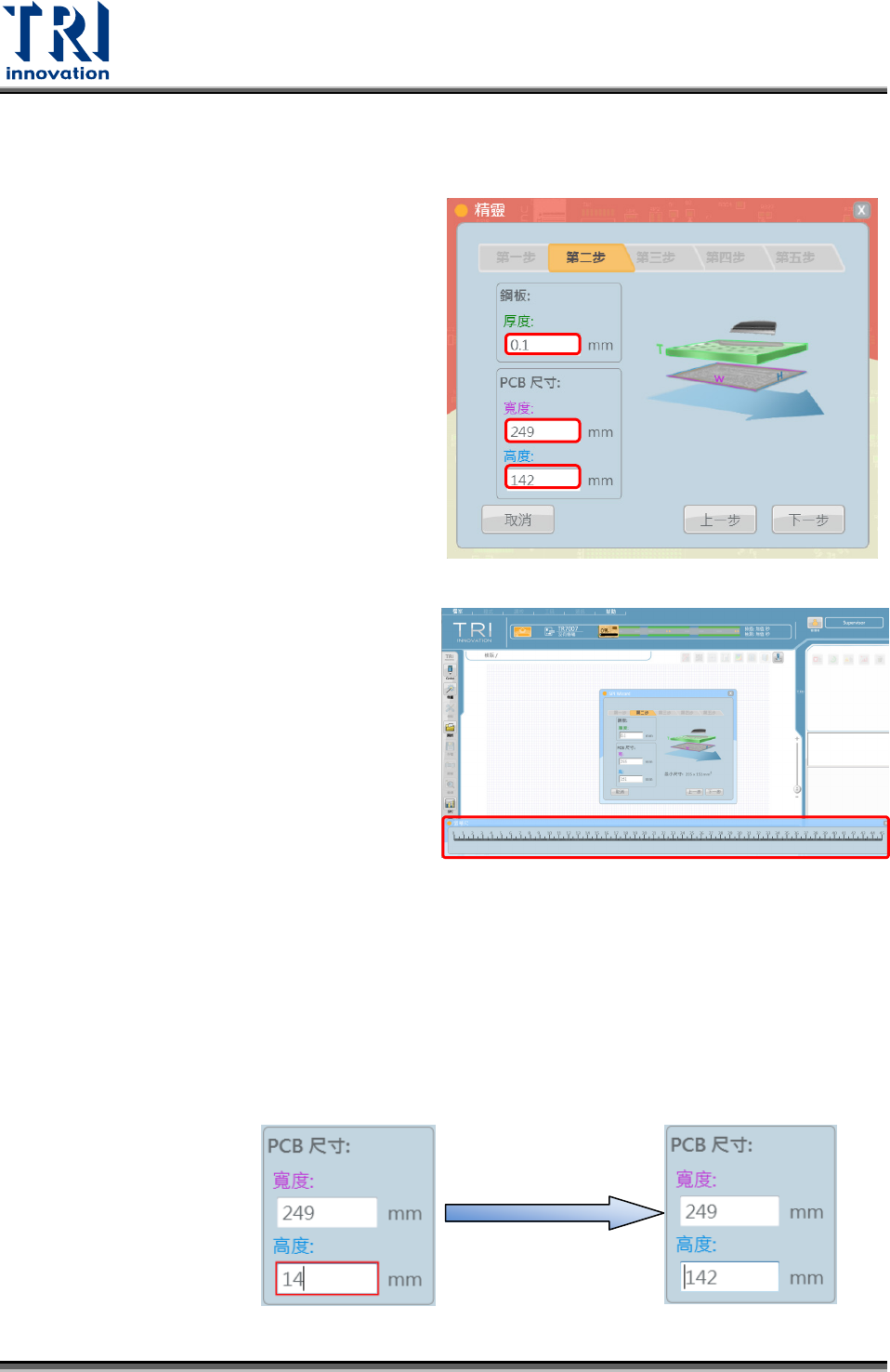 Test Research, Inc. 12 TR 7007 User Guide – Softwa re 2.2.2 第二步:輸入鋼板厚度以及 PCB 尺寸 I. 在各欄位中輸入鋼板厚度以及 PCB 的實際長寬尺寸,若有載具則輸入載 具尺寸。 II. 接著點選 [ 下一步 ] 鍵。 ( 若現場無量測板寬的工具,可利用 螢幕上的尺規 ) ※在進入 SPI 精靈此步驟時系統會將 SPI 檔裡的板尺寸值設為長度與寬度,若更 改其值並且輸入低…