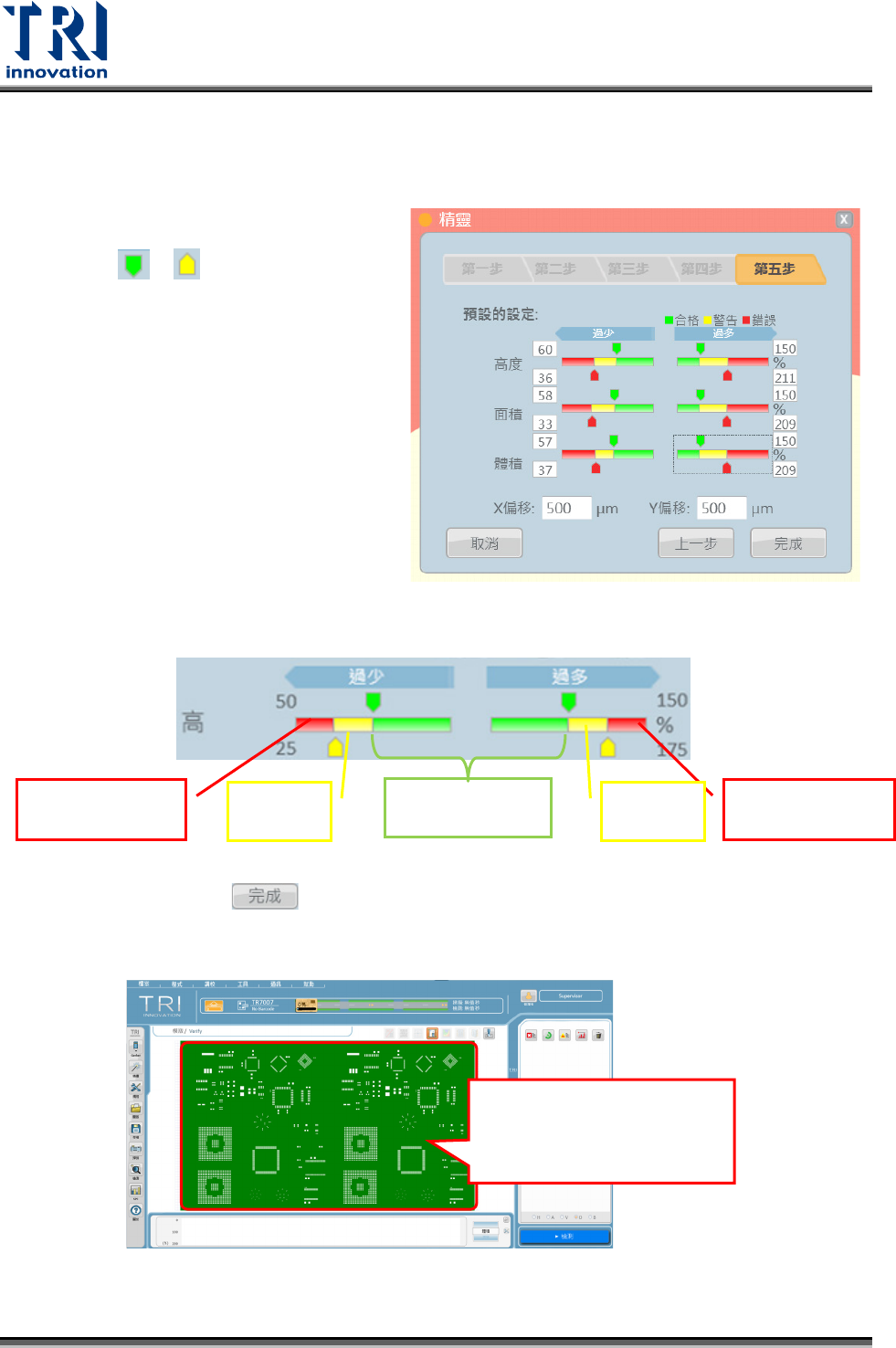 Test Research, Inc. 16 TR 7007 User Guide – Softwa re 2.2.5 第五步:設定規格上下限 I. 在此一步驟中,使用者 可以滑鼠 拖曳 和 鈕調整面積、體積 的規格上下限以及 X 與 Y 方向的 偏移量。 II. 設定完成後點選 鍵,完成精靈 的設定 III. 完成精靈設定後主程式的影像如下圖 代表錫膏過高 代表錫膏過低 錫膏標準區域 警告區 警告區 完成 Wizard 步驟後的板 子…