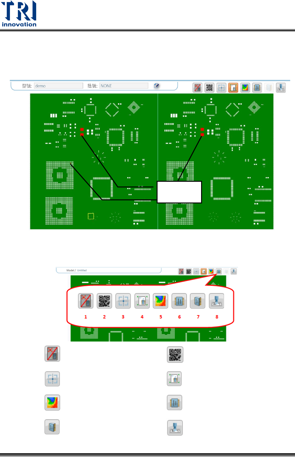 Test Research, Inc. 20 TR 7007 User Guide – Softwa re 2.3.2 大圖影像 會將檢測為不良的錫點以紅色顯示,如下圖所示。 藉由點擊右上角的 6 個圖示可切換檢視的方式,其中 1 、 2 、 5 及 6 為大圖檢視方式的 切換,由左至右依序為: 壞板標記 檢視條碼設定 檢視對位點設定。 將大圖切換成 CAD 圖顯示 HAV 側視圖 將大圖切換成實際影像顯示 檢視【選取錫膏】之 3D 圖…