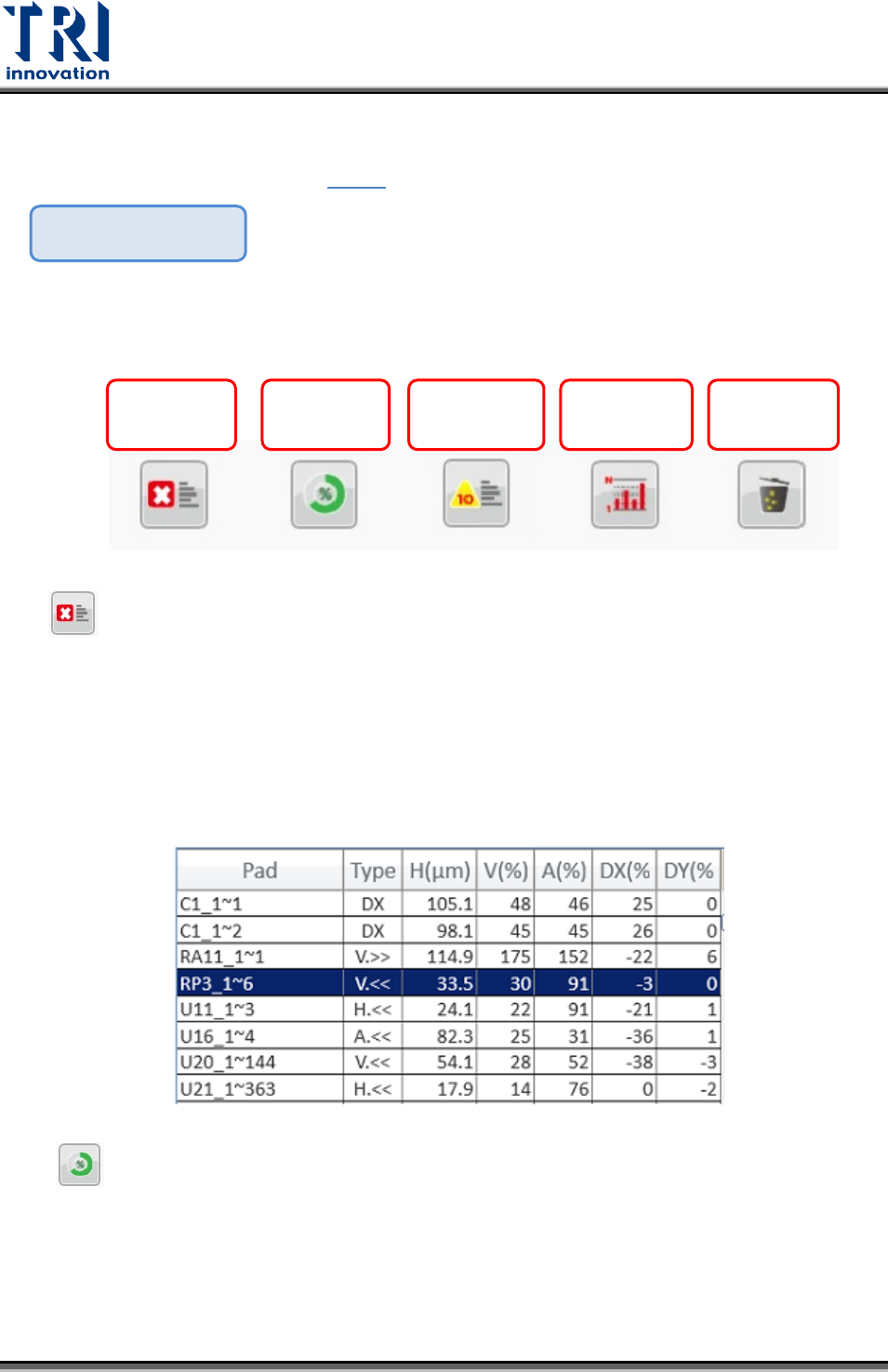 Test Research, Inc. 22 TR 7007 User Guide – Softwa re ※檢測結果為對位點失敗:須檢查對位點 1 是否在對位點搜尋範圍內,若否則移動搜 尋範圍,相關設定請參閱第 3.3 章 。 列出不良元件、不良 種類 、直通率、 不良元件前 10 名以及重置直通 率與不良 元件。 不良元件列表:點選後列出不良元件其 不良類型 ,以及 高度 ( 單位μ m) 、 體積 ( 單位 %) 、 面積 ( 單…