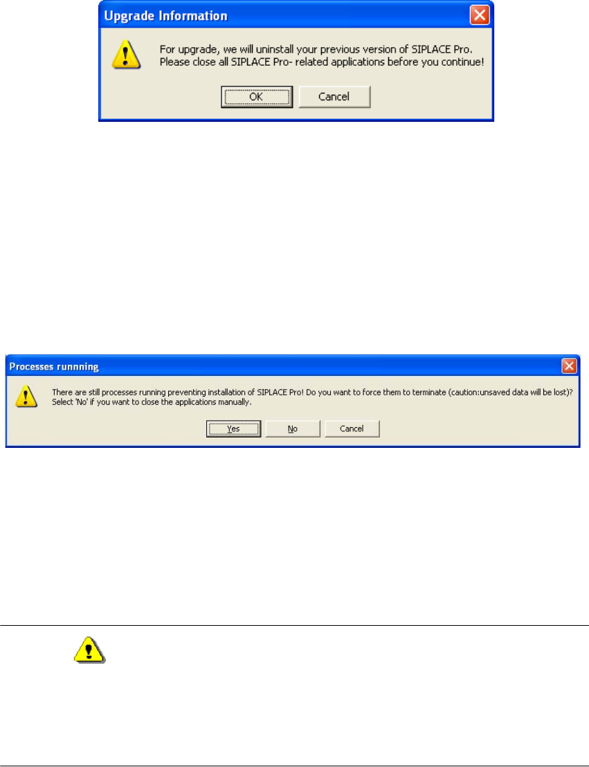 If you want to continue with Upgrade, you have to close all SIPLACE Pro- related applications