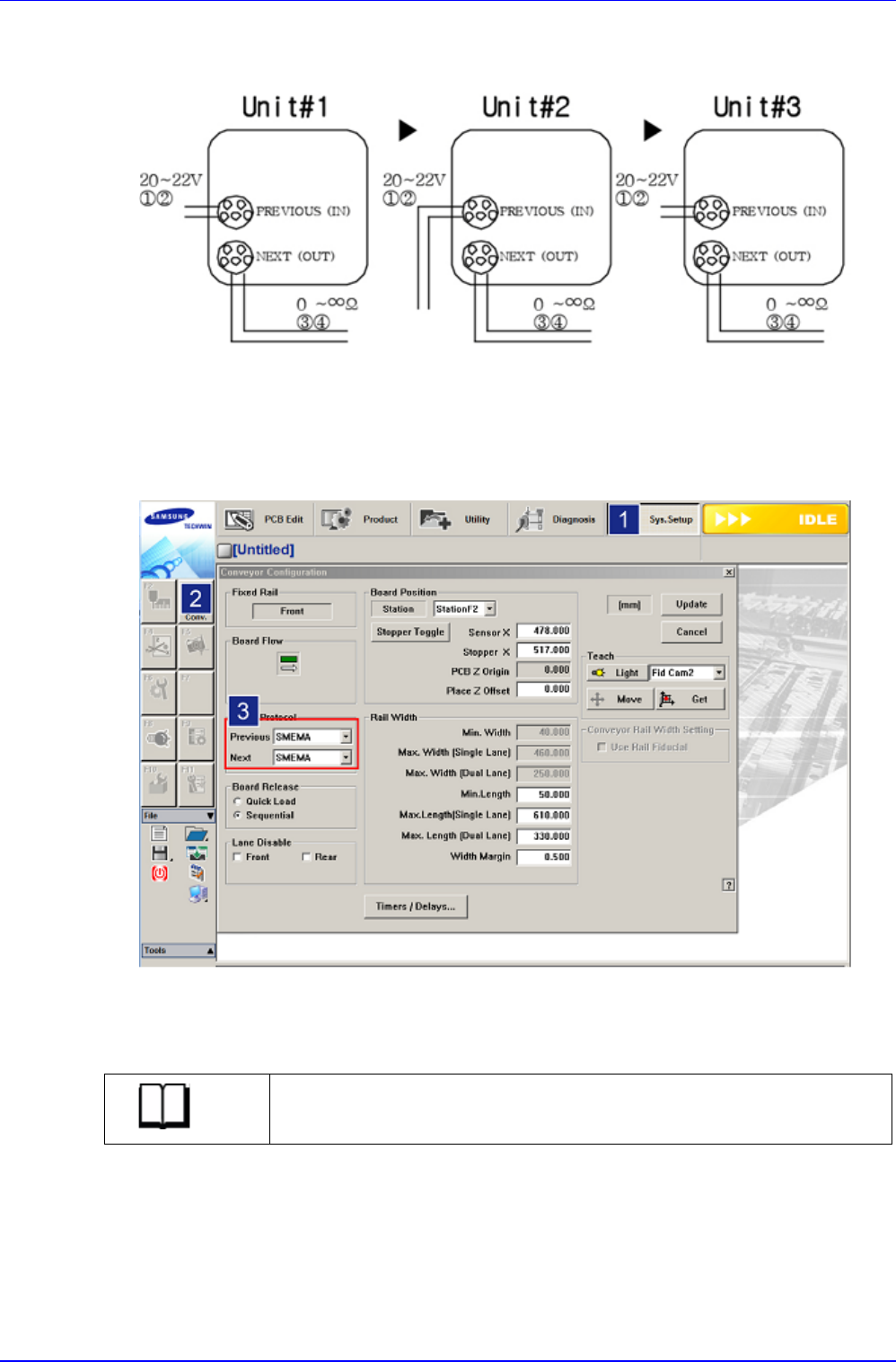 3. 选择MMI的<Sys.Setup> → <Conveyor>后,设定<Inline Protocol>项目的<Previous>和
