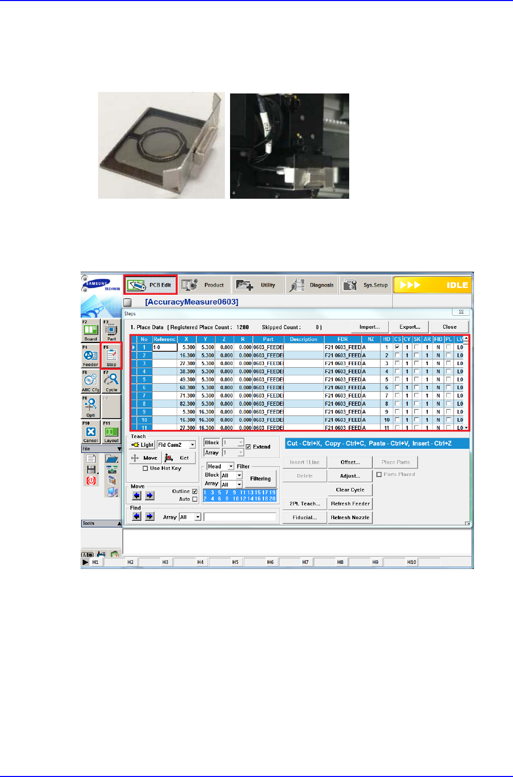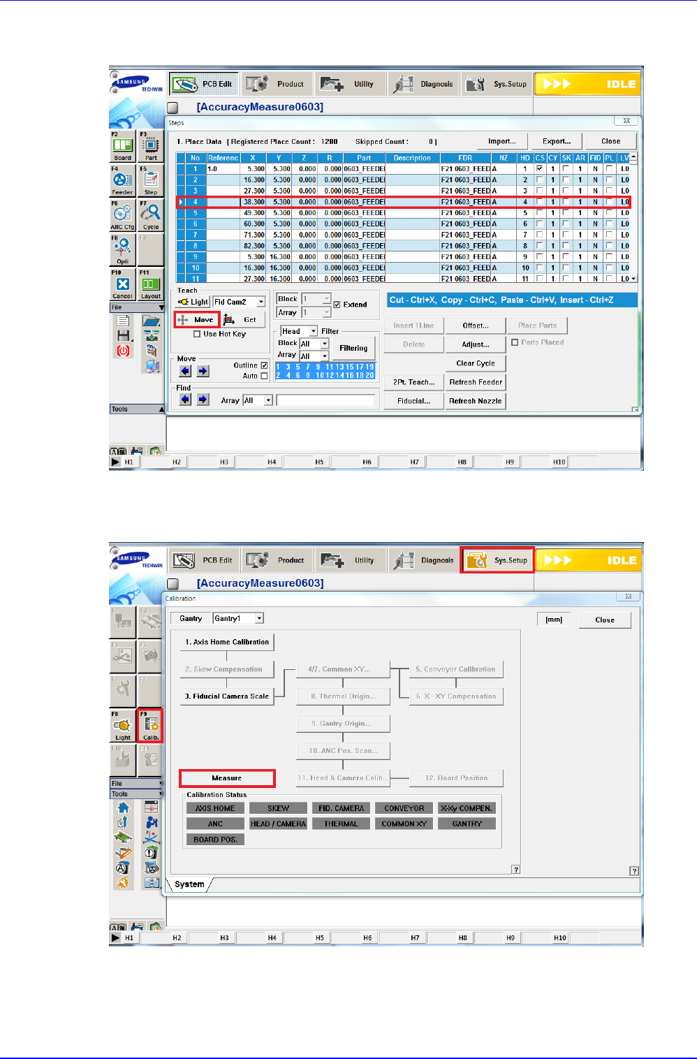 附件 3-49 3.2.1.2. 程度检查 用 Fiducial Camera 查看所 安装零件的同时,检查零件的 安装程度。 检测到零件上发生问题时 ,变更照明设定 ( 一般芯片为 6 ~ 7 左右 ) Fiducial Camera 上附着偏光过滤器 ■ 工作顺序 1. 完成零件安装时,点 击 MMI 的 <PCB Edit> → <Step> 后,确认是否设定为 <T each> 的 &…