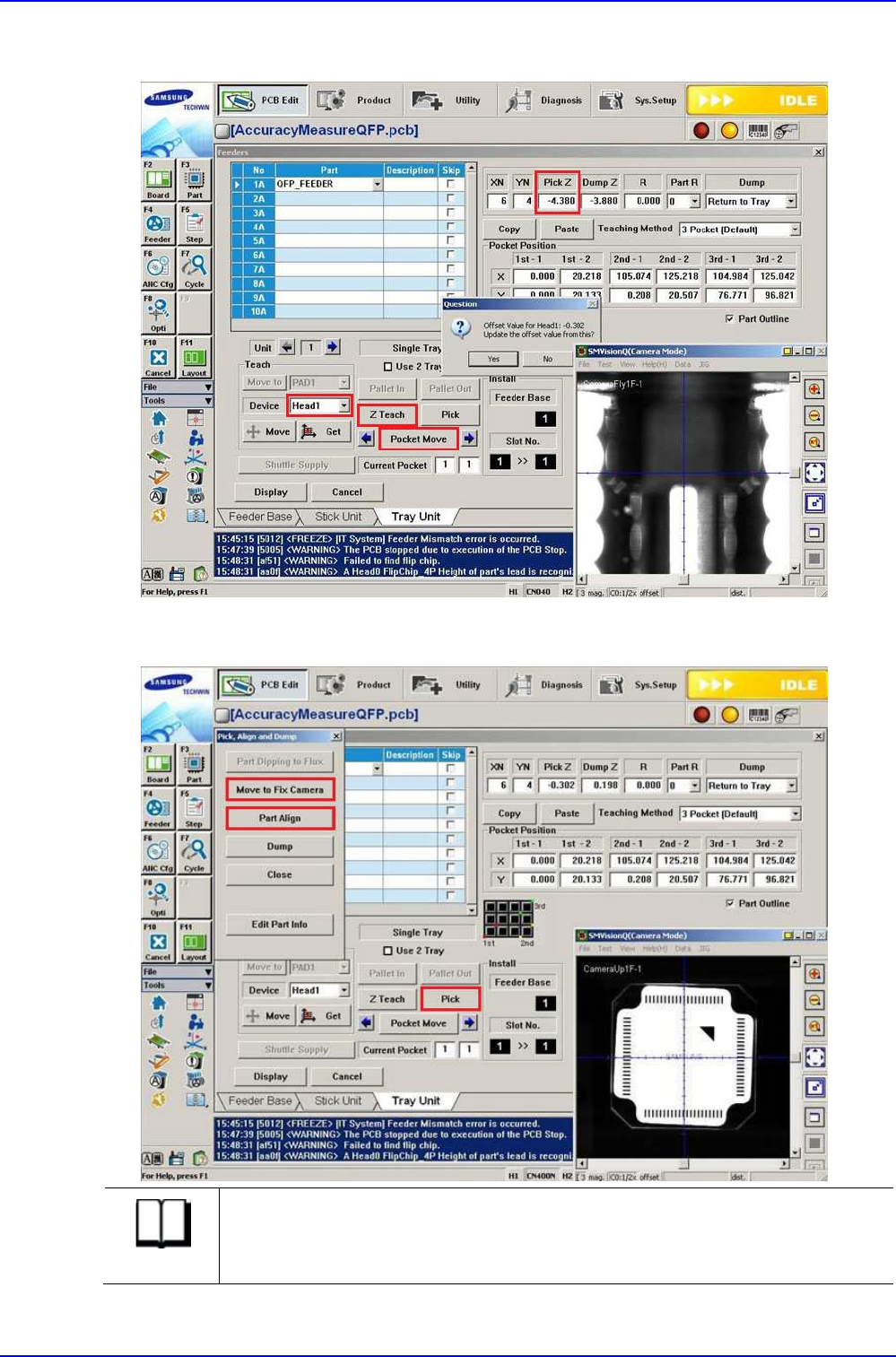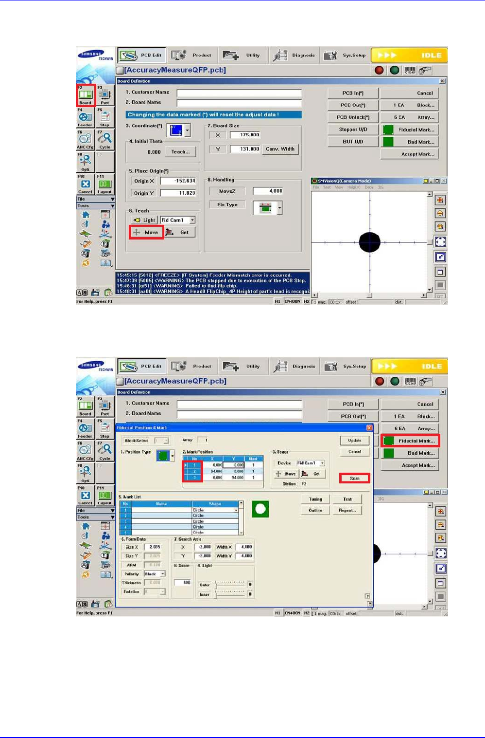 SAMSUNG DECAN Series Service Manual 3-58 13. 点击 MMI 的 <Board> ,点击 <T each> 项目的 <Move> 后,确认是否识别 Jig 左下方的基准符 号 14. 点击 <Fiducial Mark & Position> ,各选择 <Mark Position> 项目的 1 、 2 、 3 ,点击 Scan…