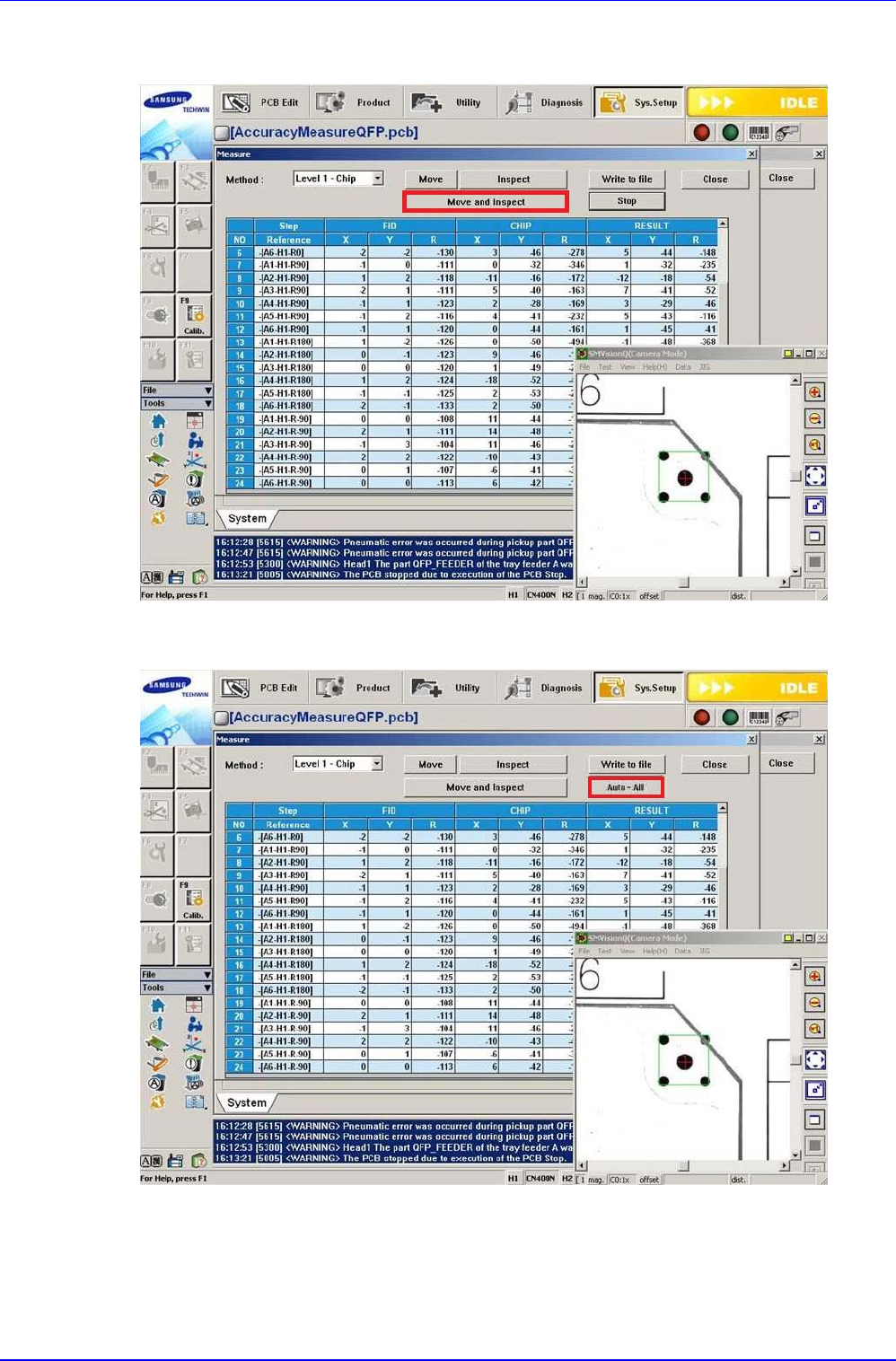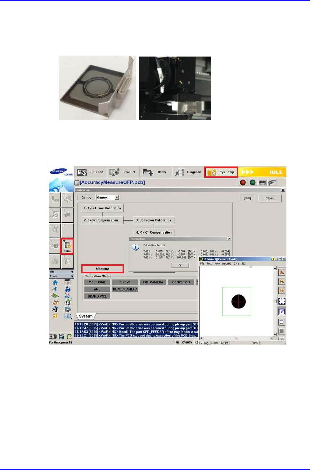 附件 3-61 3.2.2.2. 程度检查 用 Fiducial Camera 查看所 安装零件的同时,检查零件的 安装程度。 零件 检测 上发生问题时,变更照明设 定 Fiducial Camera 上附着偏光过滤器 ■ 工作顺序 1. 点击 <Sys.Setup> → <Calib> → <Measure> ,进行 Jig 的 Fiducial Mark Scan